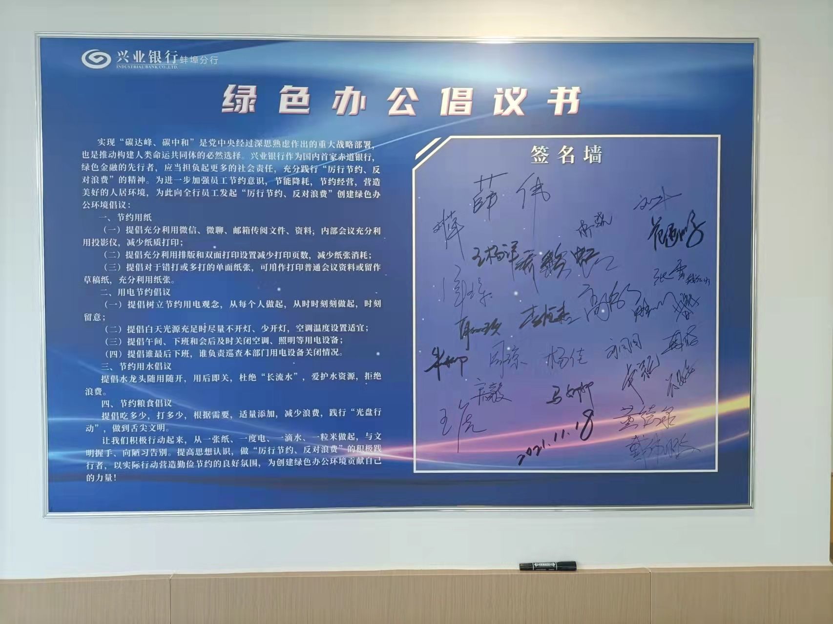 自开业以来,兴业银行蚌埠分行始终践行低碳、绿色发展理念,积极营造绿色办公环境,提升全员低碳出行、节约水电、节约纸张的意识,践行企业社会责任,为建设美好绿色蚌埠贡献力量。