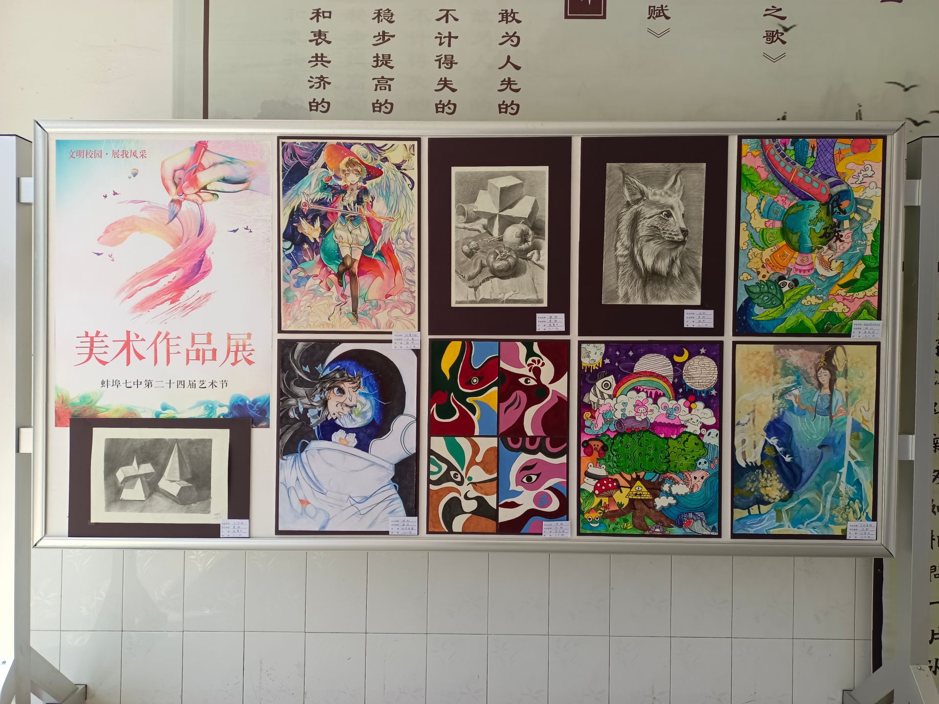 为活跃校园文化气氛,丰富师生课余文化生活,促进书画艺术的发展,弘扬民族文化,建设文化校园,3月25日,我校以“书画青春,激扬风采”为主题,举办了“蚌埠七中第二十四届文化艺术节书画展”,优秀的美术、书画等作品吸引了全校师生的驻足参观。