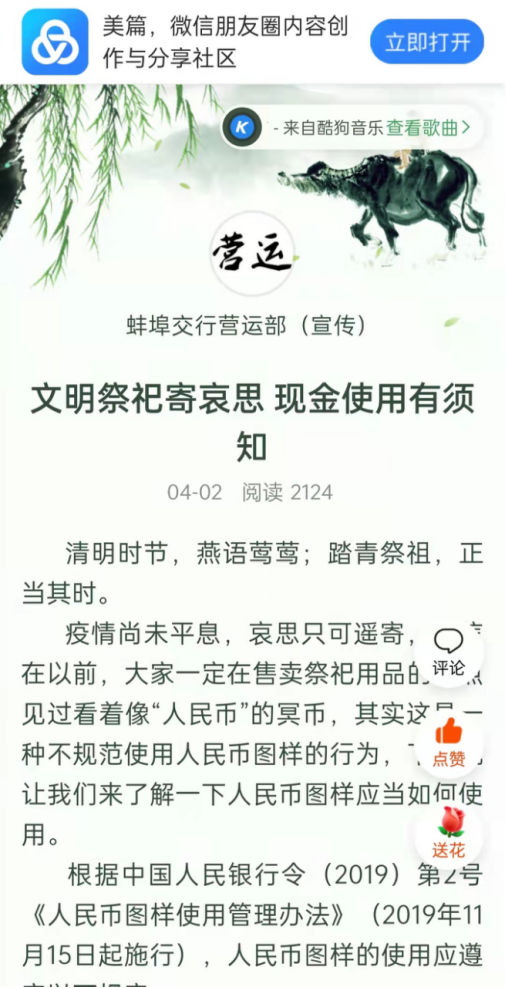 分行营运管理部制作宣传美篇《文明祭祀寄哀思 现金使用有须知》,采用图文结合的形式,向公众普及人民币图样使用管理办法;残缺、污损人民币兑换须知;整治拒收人民币管理要求;反假货币和爱护人民币相关知识。分行员工积极转发宣传,文章阅读量超2100次。