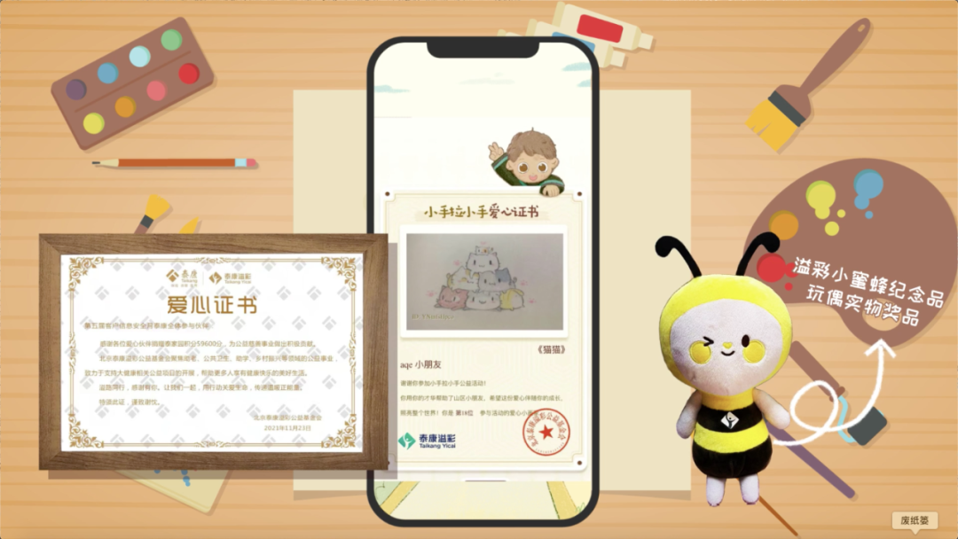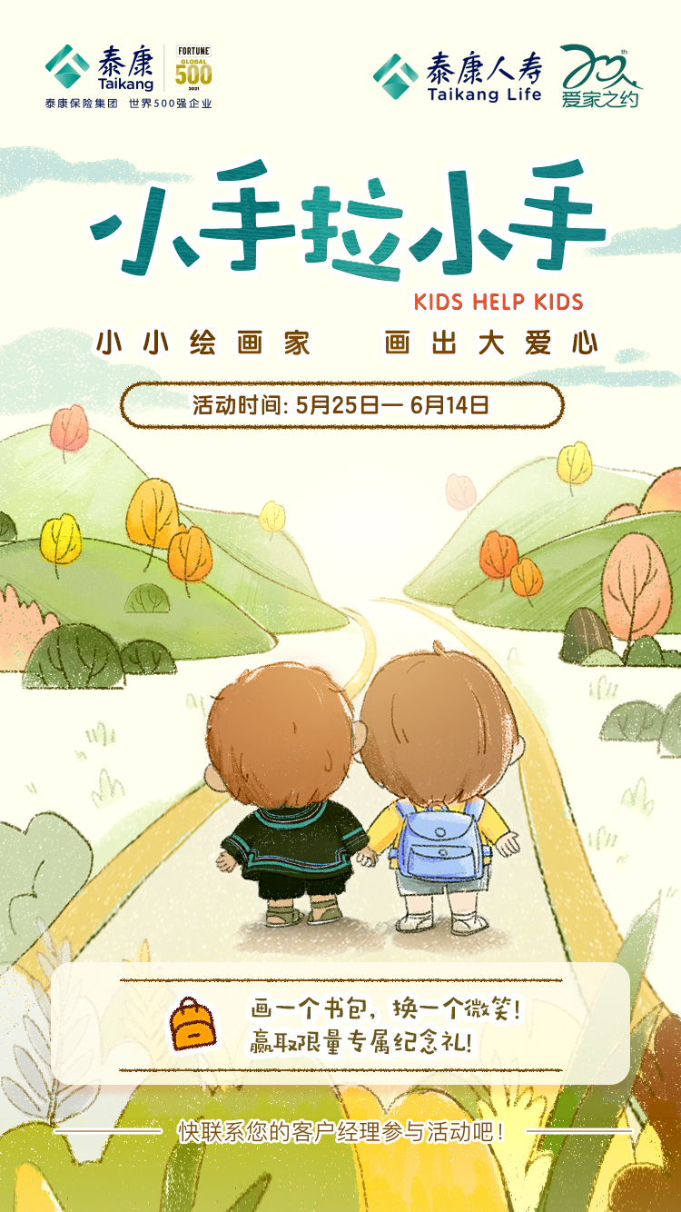 此次“小手拉小手"公益活动自5月25日启动,由泰康人寿、泰康溢彩联合客户发起,并在泰康溢彩公益基金会设立 小手拉小手 公益项目。希望小朋友们通过公益参与和爱心帮扶,助力乡村小朋友们健康快乐地学习成长,并从中感受分享和互助的美好。