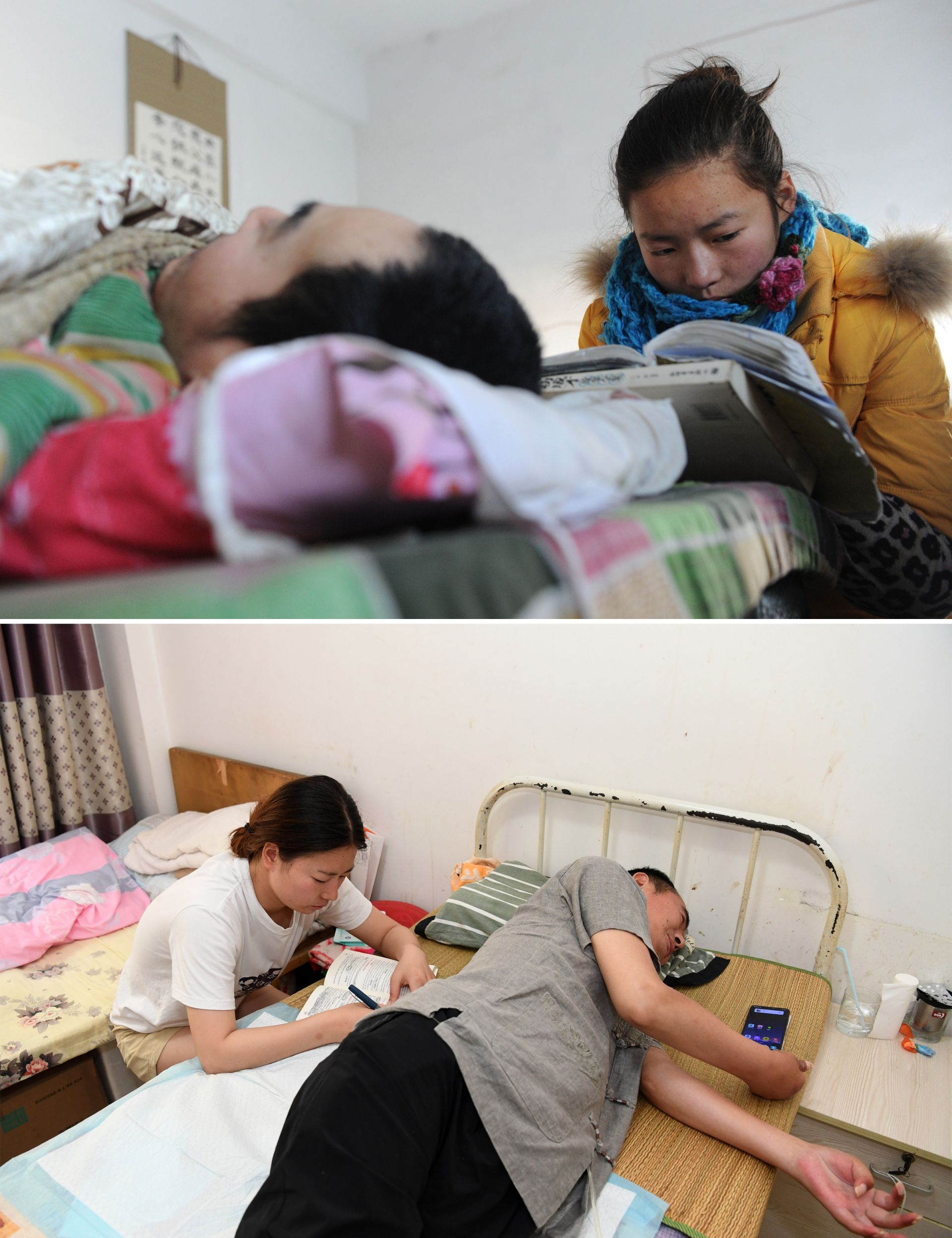 14岁时的黄凤为躺在板车上的爸爸翻身(2011年1月1日摄)