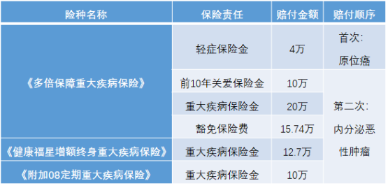 2022年1月,W女士又确诊罹患了内分泌恶性肿瘤,再次提交理赔申请,经公司审核符合条款规定的重大疾病保险责任,W女士获赔重大疾病保险金等共计52.7万元,且豁免了《多倍保障重大疾病保险》剩余17年的保费,《多倍保障重大疾病保险》继续有效。此外,住院医疗费用个人自付部分全部由《康健华贵B款医疗保险》承担。