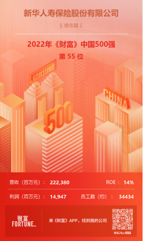 5月12日,美国《福布斯》杂志发布2022年度“全球上市公司2000强"榜单。新华保险连续第九年进入榜单前500强。榜单期内,公司营收344亿美元,利润23亿美元,资产1764亿美元,居榜单第476位,在进入榜单的中国内地保险公司中排名第4。