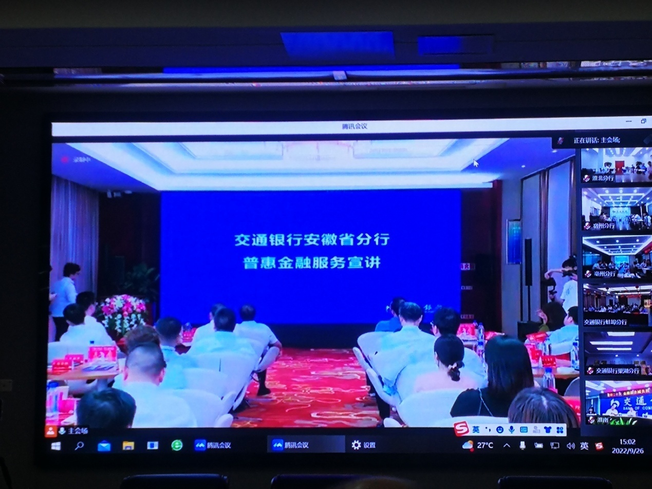 9月26日,为了持续优化营商环境,迎接党的二十大胜利召开,安徽银保监局联合多家单位在安徽省金融教育示范基地作为主会场开展全省“喜迎二十大 金融助企减负担,教育宣传在行动”直播活动。交通银行蚌埠分行作为本次蚌埠地区分会场承办方,协助市银保监分局组织开展活动事宜,并取得圆满成功。为扩大本次专题活动效果,活动邀请了市发改委、市经信局等政府部门,徽商银行蚌埠分行、光大银行蚌埠分行、民生银行蚌埠分行等金融机构,以及安徽丰原集团有限公司、凯盛科技股份有限公司、安徽汇精模具有限公司等企业代表。