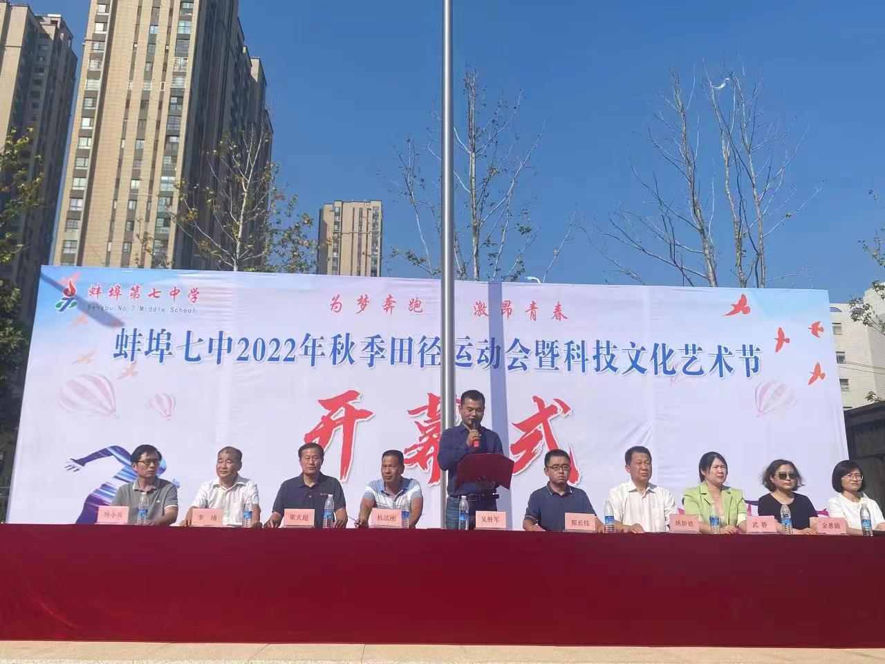 张局长首先对蚌埠七中2022年秋季运动会表示热烈祝贺,希望每位运动员精神饱满,斗志昂扬,拼出成绩,赛出风格,让青春的活力迸发在赛场上的每个角落;希望全体裁判员、工作人员忠于职守,树立安全第一意识、热情服务意识、严守规则意识,做到公正裁判,办出最具特色的运动会。副校长(主持工作)吴胜军宣布:蚌埠七中2022年秋季田径运动会现在开幕,整个校园喜气洋洋,热闹纷呈。