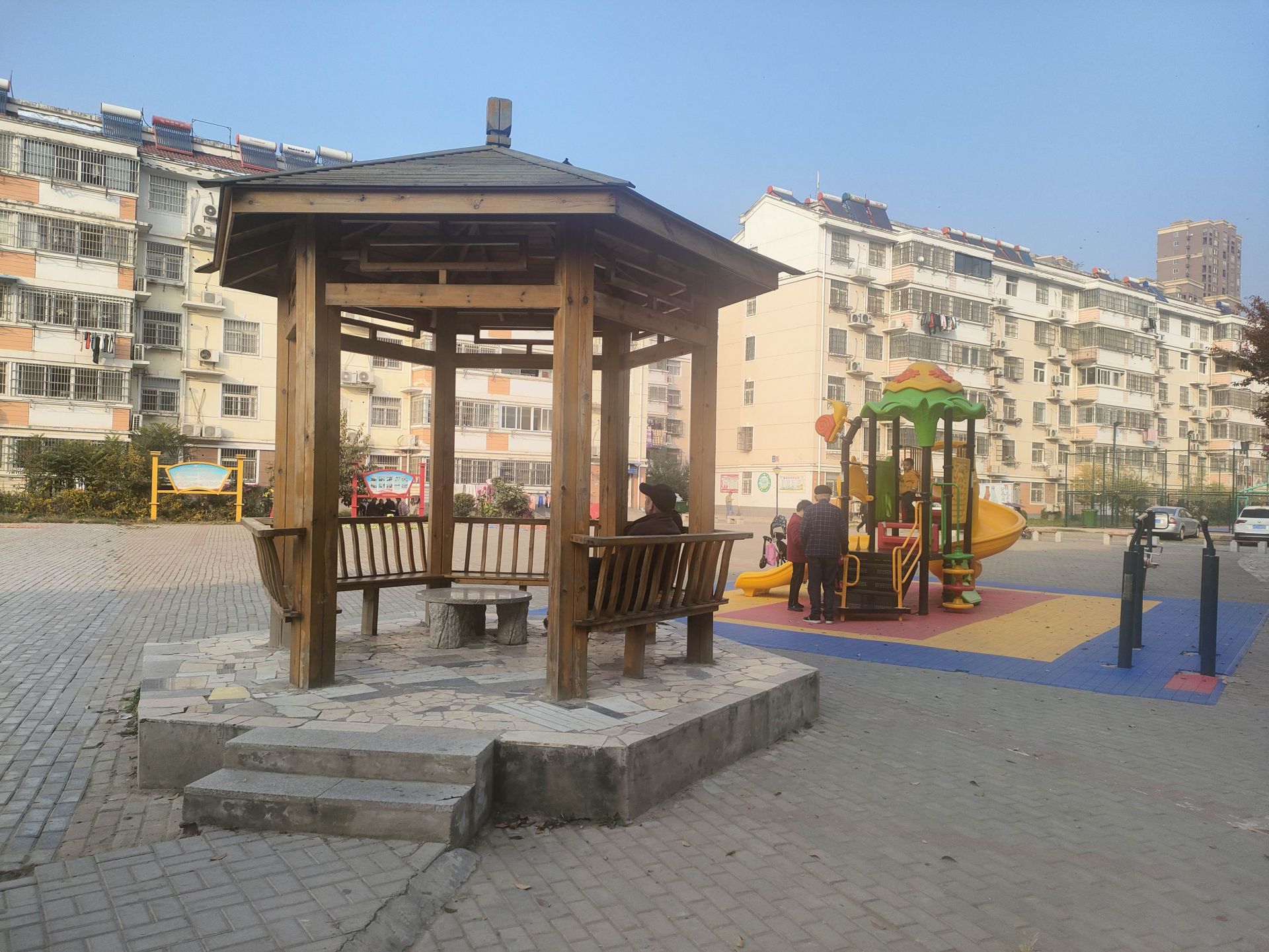 记者在桃花园社区看到,只见原先的低洼地变成了长方形的广场,地面铺设了整齐的面包砖,两侧安装了路灯,在广场南侧设有木制长廊凉亭、儿童娱乐设施以及健身器材,个别老人正在凉亭里休息,几个孩子则在旁边玩耍,一派安乐祥和的景象。