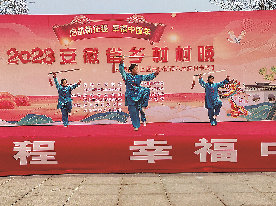 “咚咚锵,咚咚锵”……下午两点半,踩着欢快的花鼓节拍,由八大集村花鼓灯艺术团表演的《鼓乡的春天》正式拉开了当天“村晚”活动的序幕。舞蹈《再唱山歌给党听》、女声独唱《梦中的村庄》、音乐快板《学习雷锋好榜样》、泗州戏小品《父子情》、太极剑表演……内容丰富、形式多样的文艺节目轮番上演,将现场气氛一次次推向高潮,不断赢得台下观众的阵阵喝彩。