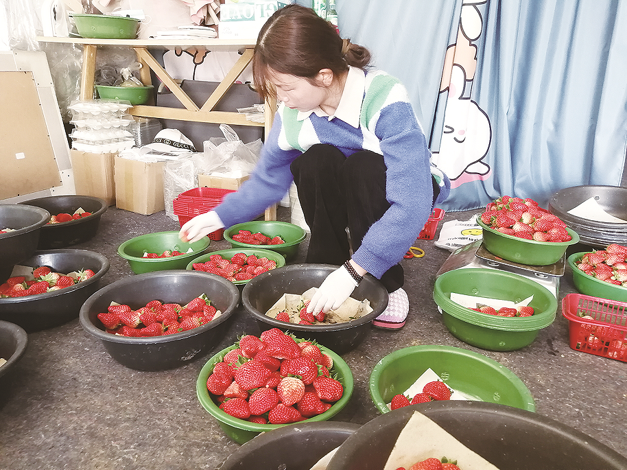 社员在按大小分拣草莓