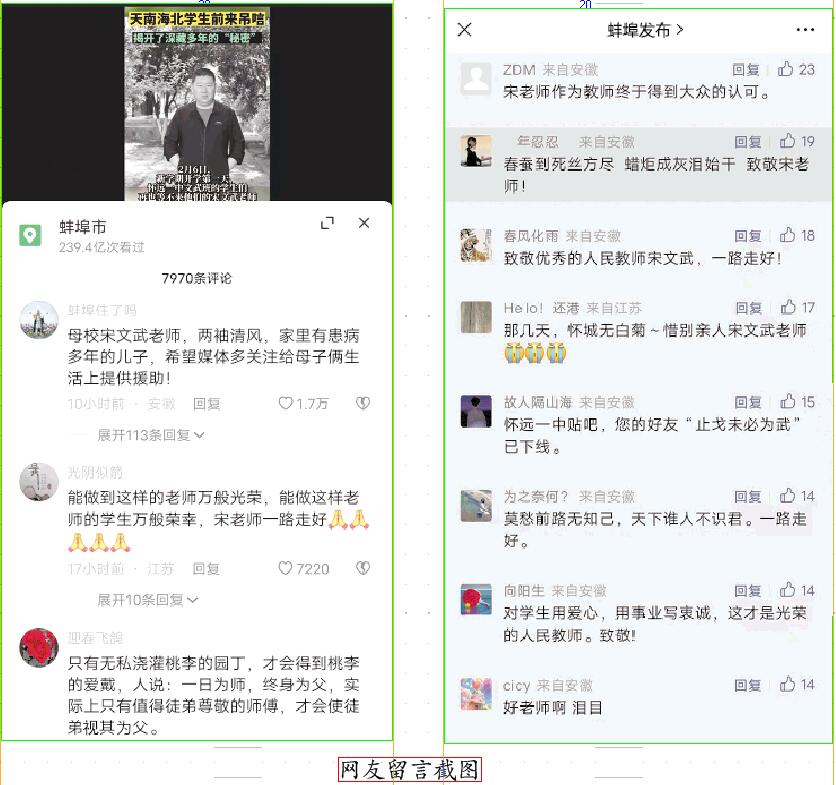 从2月6日开始,蚌埠报业传媒集团在蚌埠日报、蚌埠日报微信公众号、蚌埠发布微信公众号、蚌埠日报抖音号、最蚌埠微信号、最蚌埠视频号、蚌埠发布客户端等多个媒体平台发布了宋文武老师的事迹后,网友纷纷在评论区表达对这位老师的敬意与缅怀。