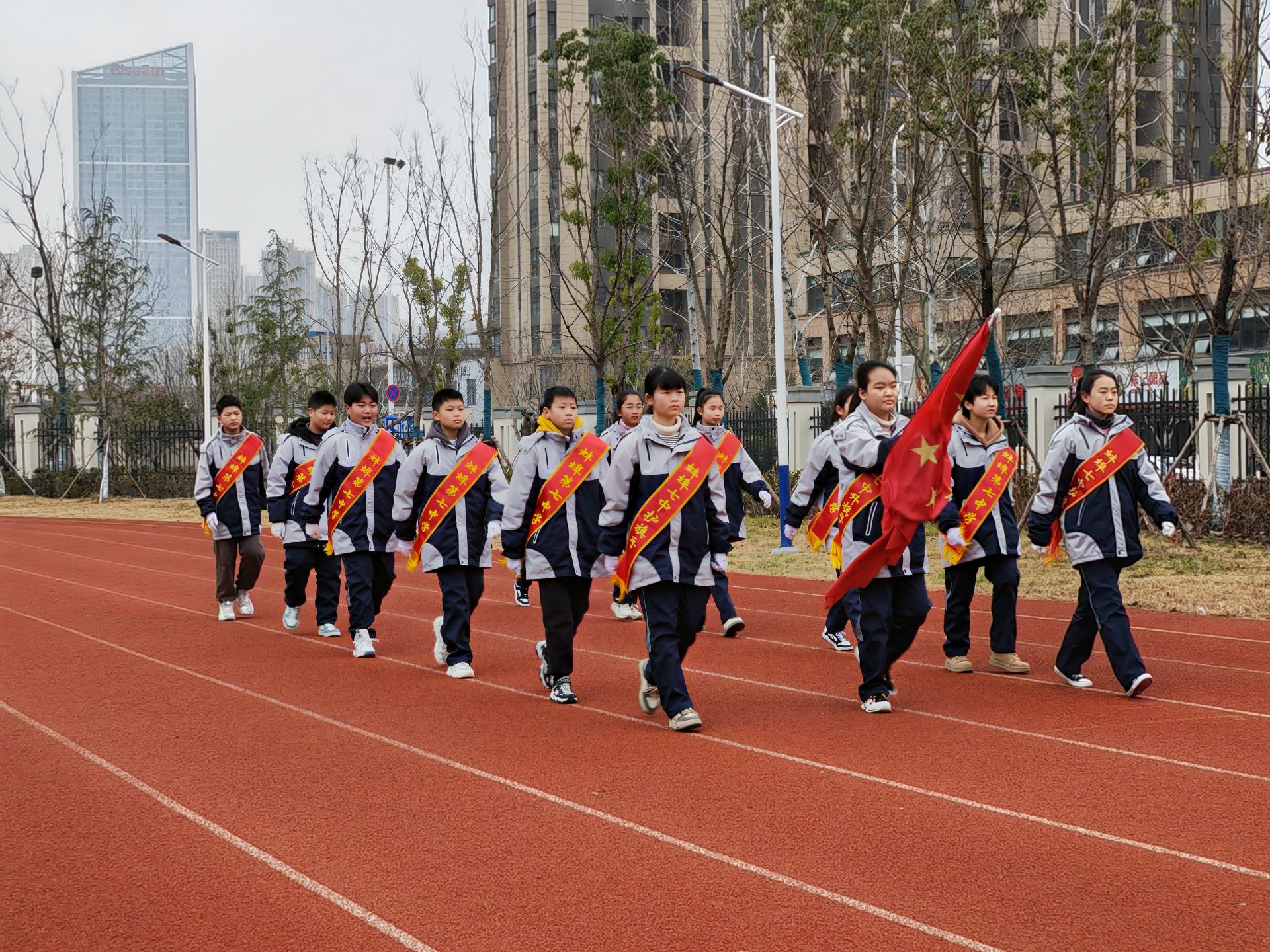 庄严的升旗仪式拉开了开学典礼的序幕。嘹亮的国歌声中,国旗护卫队护送鲜艳的五星红旗入场,全体师生高唱《中华人民共和国国歌》,面向国旗行注目礼。