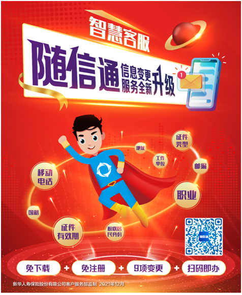 “随信通”轻量级、分布式客户服务云平台是新华保险自主研发的全新客户自助服务平台,借助免下载、免注册、精准触达、一站办理的优势,在客户有需求时,可通过短信、95567客服热线、业务员、在线客服等线上线下多种渠道向客户精准发送随信通短信或二维码,为客户提供一对一的保全办理、信息查询、资料下载等20余项服务。2022年累计服务客户近5000万人次。