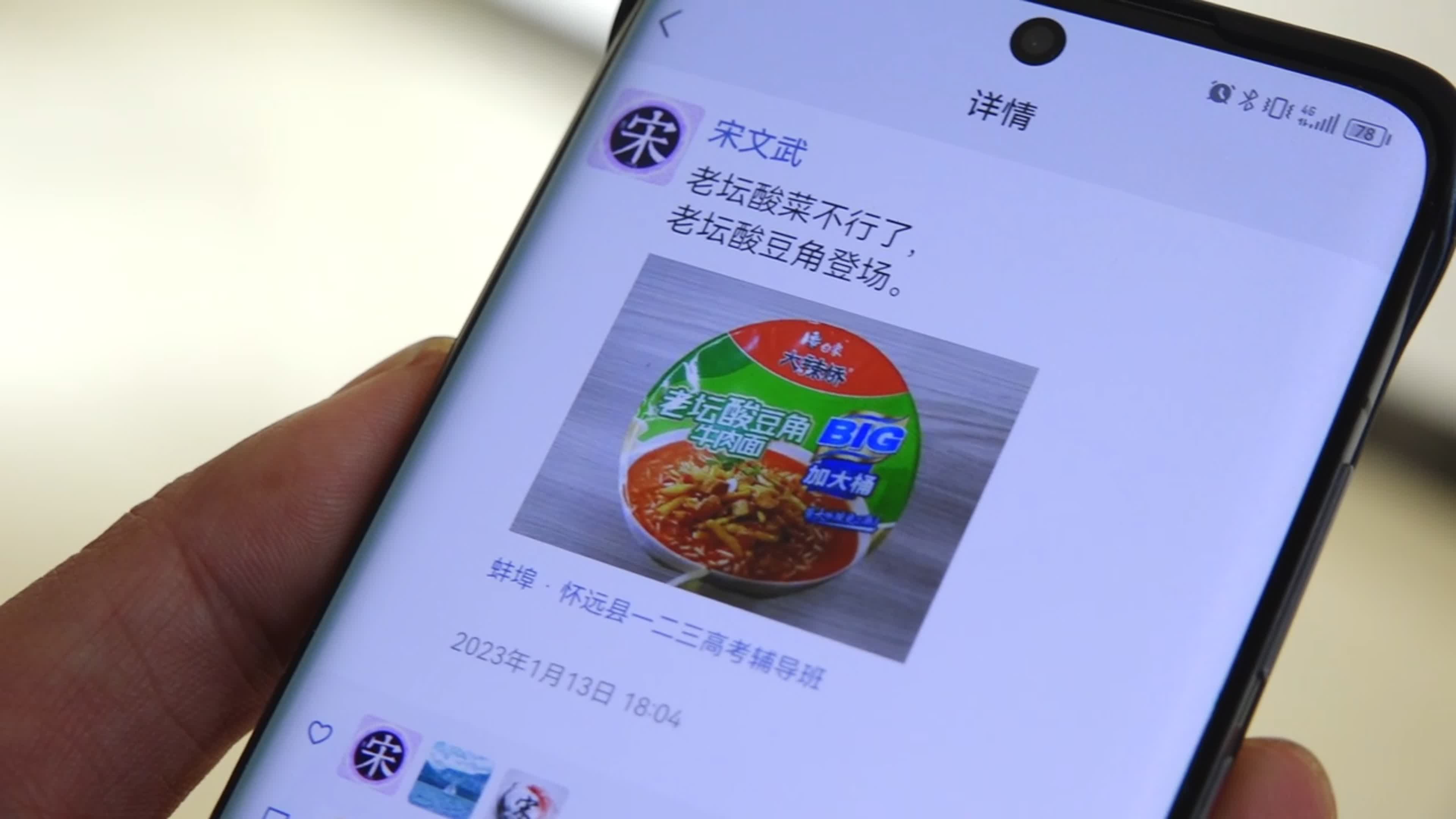 “老坛酸豆角登场!”这是放假前一天,宋文武发的一条朋友圈。其同事周远望说,宋老师在教学工作上“绝对称得上一位狂人”,为了把更多时间留给学生,方便面成了他最经常的晚饭。
