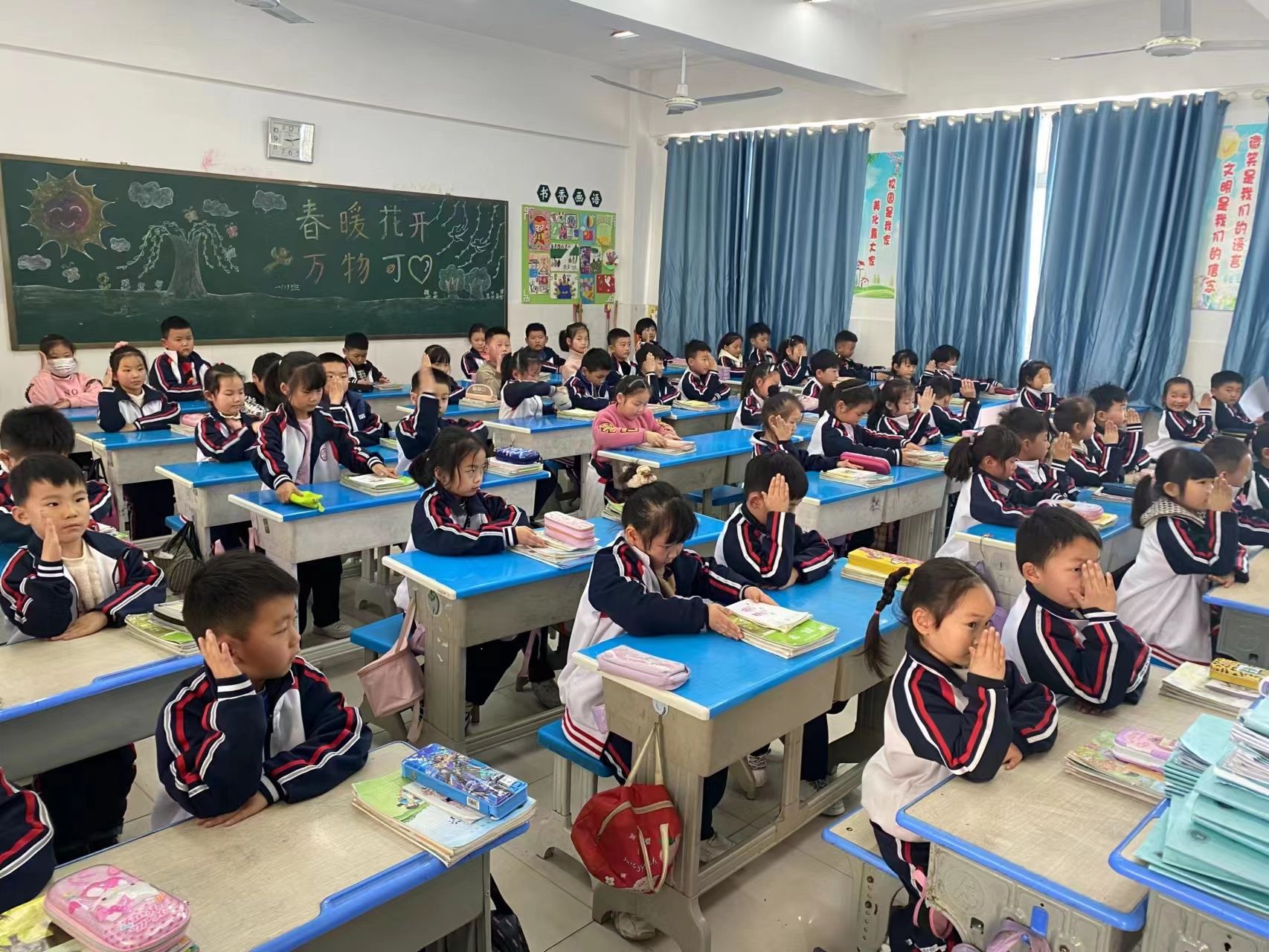 评委来啦!瞧,一二年级的小朋友个个精神抖擞,真是初生牛犊不怕虎!看我巧手变变变!刚刚乱糟糟的课桌现在焕然一新啦!