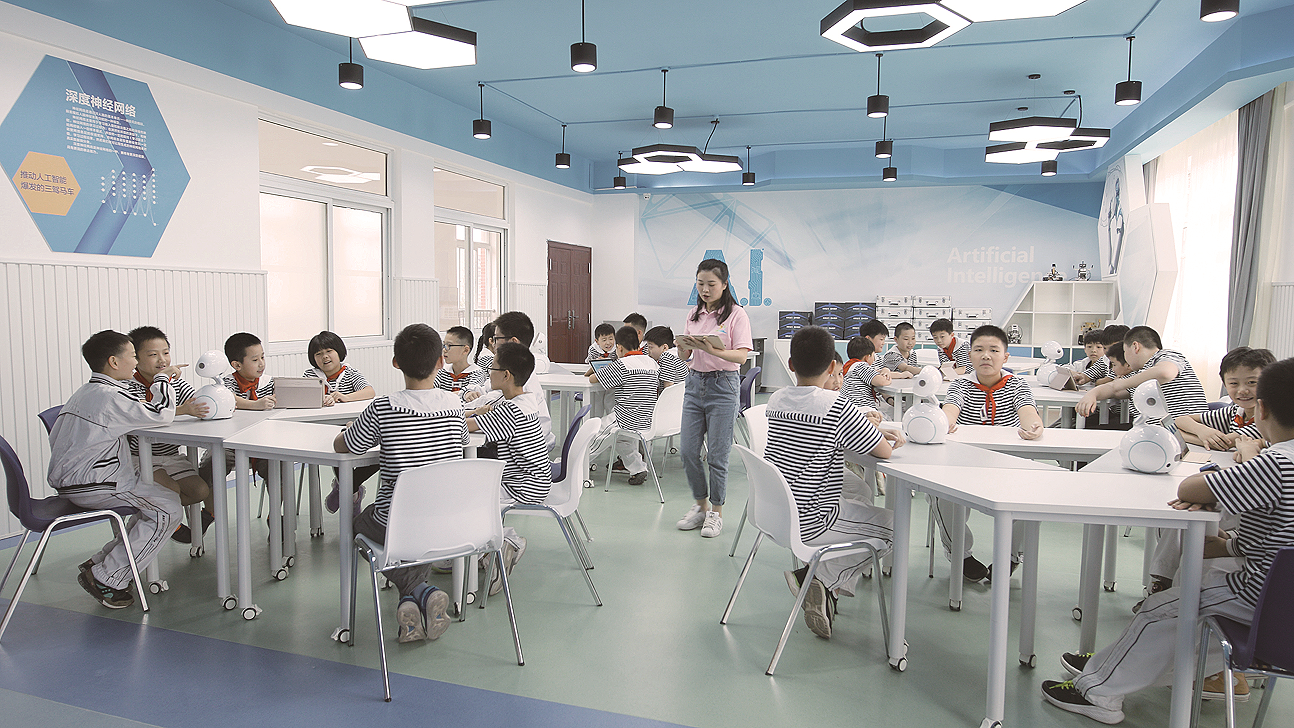 蓝天路小学的孩子们在充满科技感的教室里上课