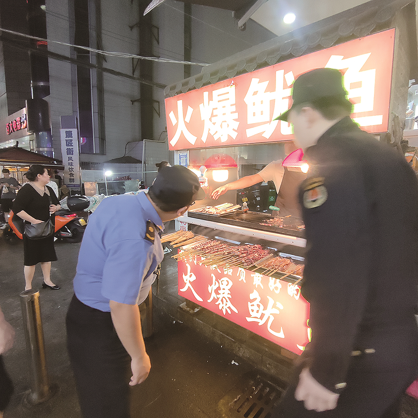 为加强对青创市集等重点区域的环境、秩序的保障,禹会区城管局一方面加强环境卫生保障,在这一街区加派夜间清扫人员和夜间垃圾清运车辆,保障环境卫生和垃圾桶即满即清,并在早间时段冲洗清洁街区路面污渍,让街区能够每晚靓丽“迎客”。另一方面,执法人员晚间加强巡查,4月28日至5月6日期间更是全员上岗,保障重点区域的经营秩序管理,坚持“疏堵结合”原则,持续开展经营秩序专项整治。巡查重点除了燃气安全隐患的整改之外,还重点巡查摊贩经营区域,保证摆摊设点都在路牙石上的道路两侧区域,不能影响路面人员通行。“特别是一些流动摊贩,为吸引更多顾客前来消费,喜欢摆在路中央经营,由于这一街区人流量太大,这样的‘聚拢人流’经营方式,容易造成道路拥堵,甚至形成安全问题,所以我们每夜往返多次步行巡查,也要劝导这样的摊贩到两侧的路牙石以上区域,保障消费者、经营者的安全和秩序。”禹会区城市管理行政执法大队大队长丁丽萍介绍。