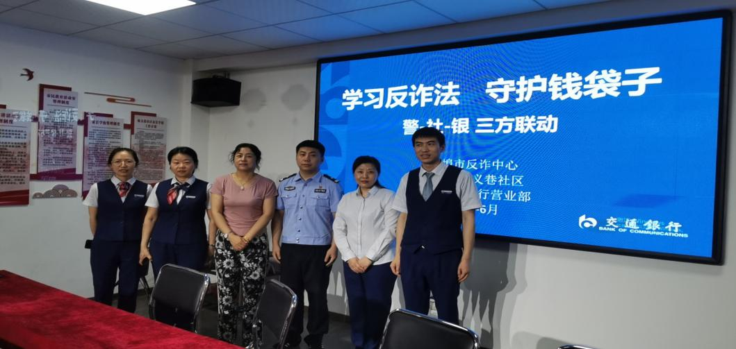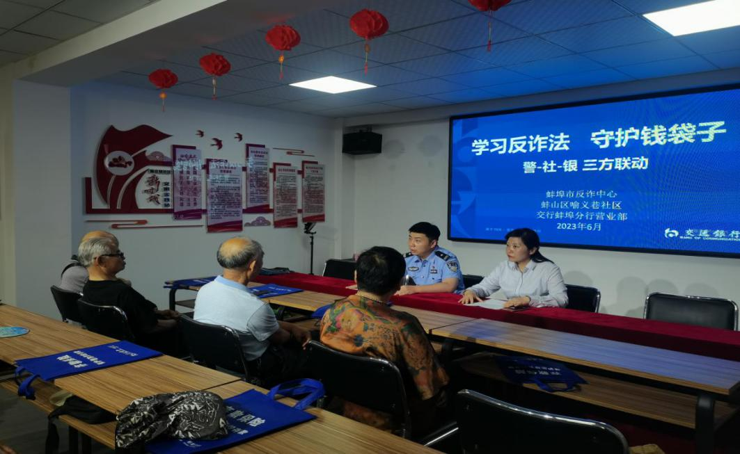 一年一端午,一岁一安康。为迎接端午佳节,保障市民平安过节,切实履行维护社会金融秩序稳定的社会责任,交通银行蚌埠营业部和消保部联合市反诈中心,带着节日祝福和满满金融知识“干货”, 于2023年6月12日走进蚌山区喻义巷社区,为老年人这一特殊群体进行了一场生动的金融知识宣教活动。
