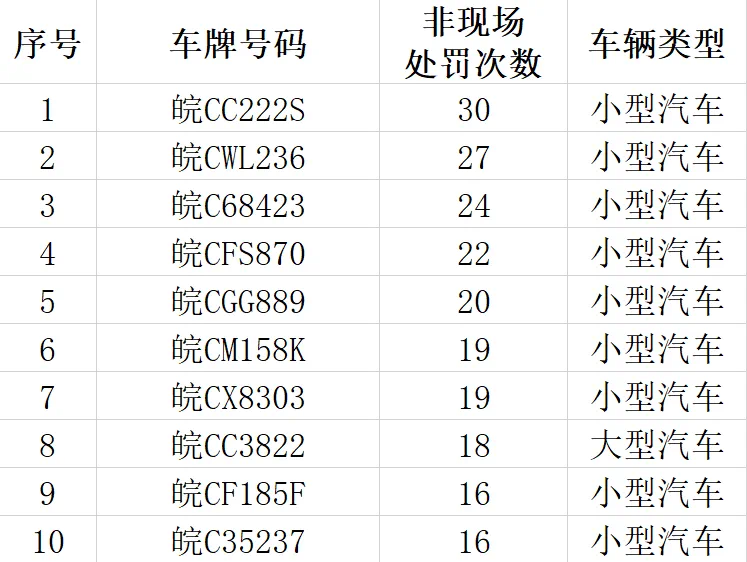 在此次曝光的交通违法车辆中,违法次数最高为30次,其中皖CC222S是此次曝光中违法次数最高的车辆。