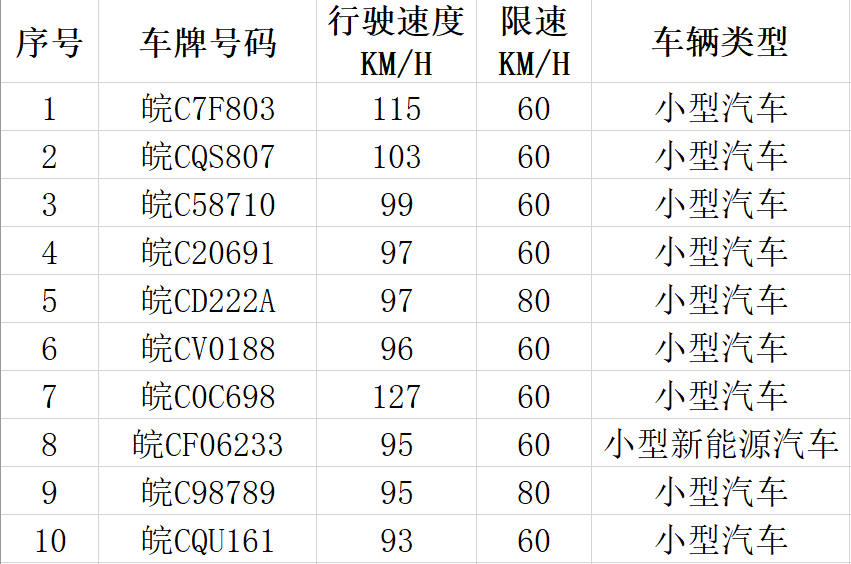 在此次曝光的超速车辆中,皖C7F803在限速60公里/小时的路段,超速至115公里/小时,超速91.6%。