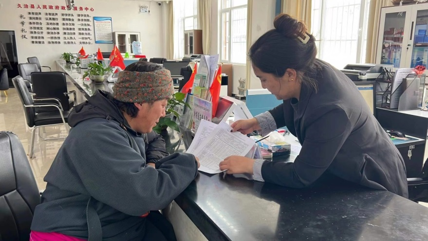 玛沁县政务服务大厅医保窗口审核员中国人寿寿险玛沁支公司员工才忠吉经常为拉毛杰做审核,她说,今年第一次看到拉毛杰自己拿着报销资料到窗口时,心中为他的病情好转感到高兴。