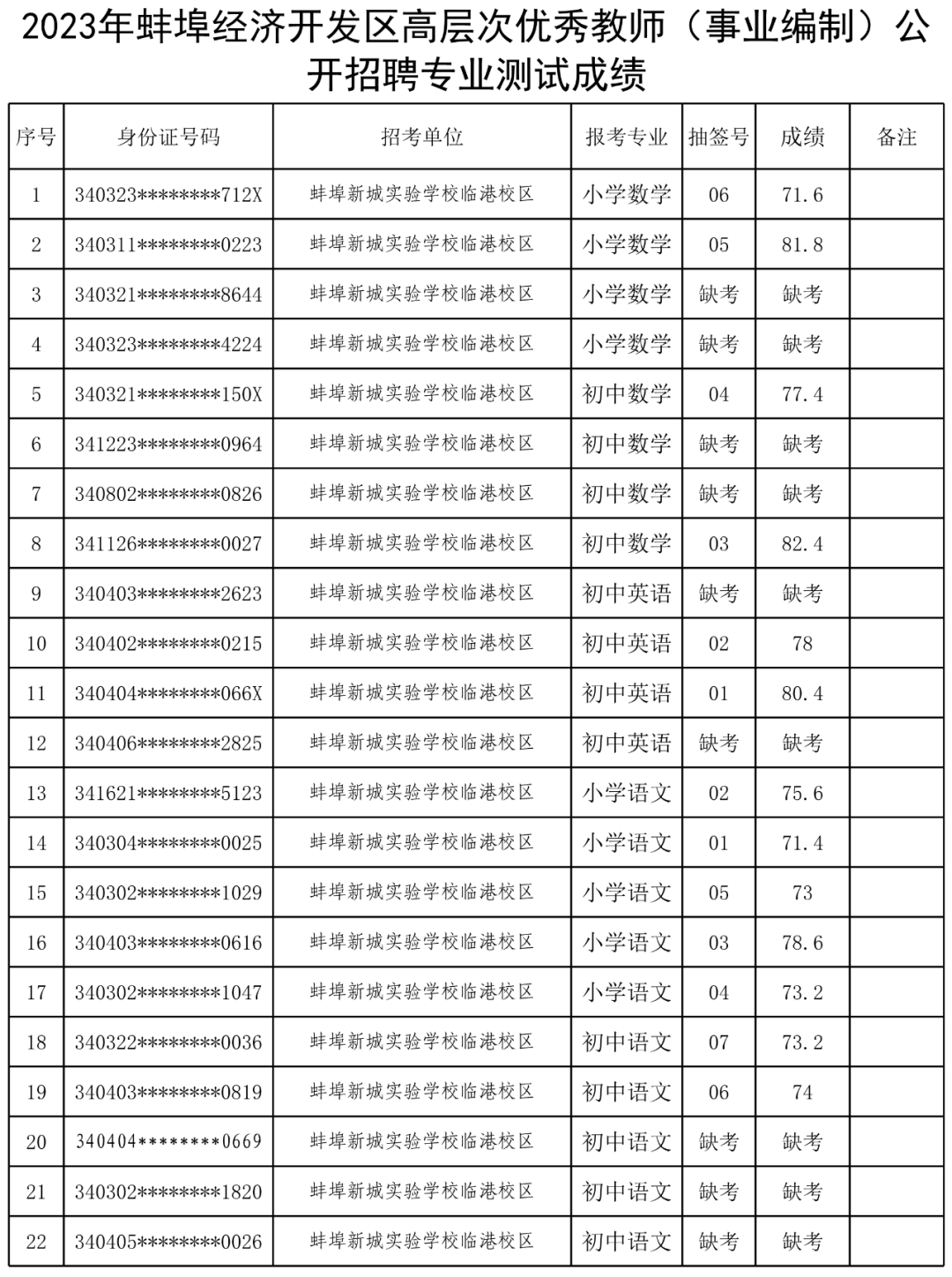 附件:2023年蚌埠经济开发区公开招聘高层次优秀教师(事业编制)专业测试成绩