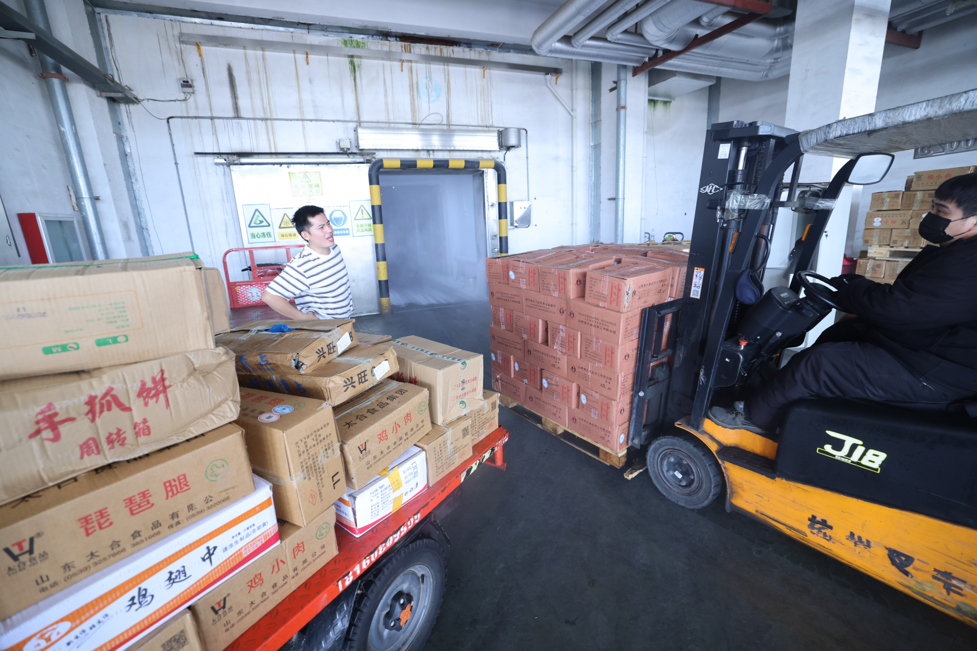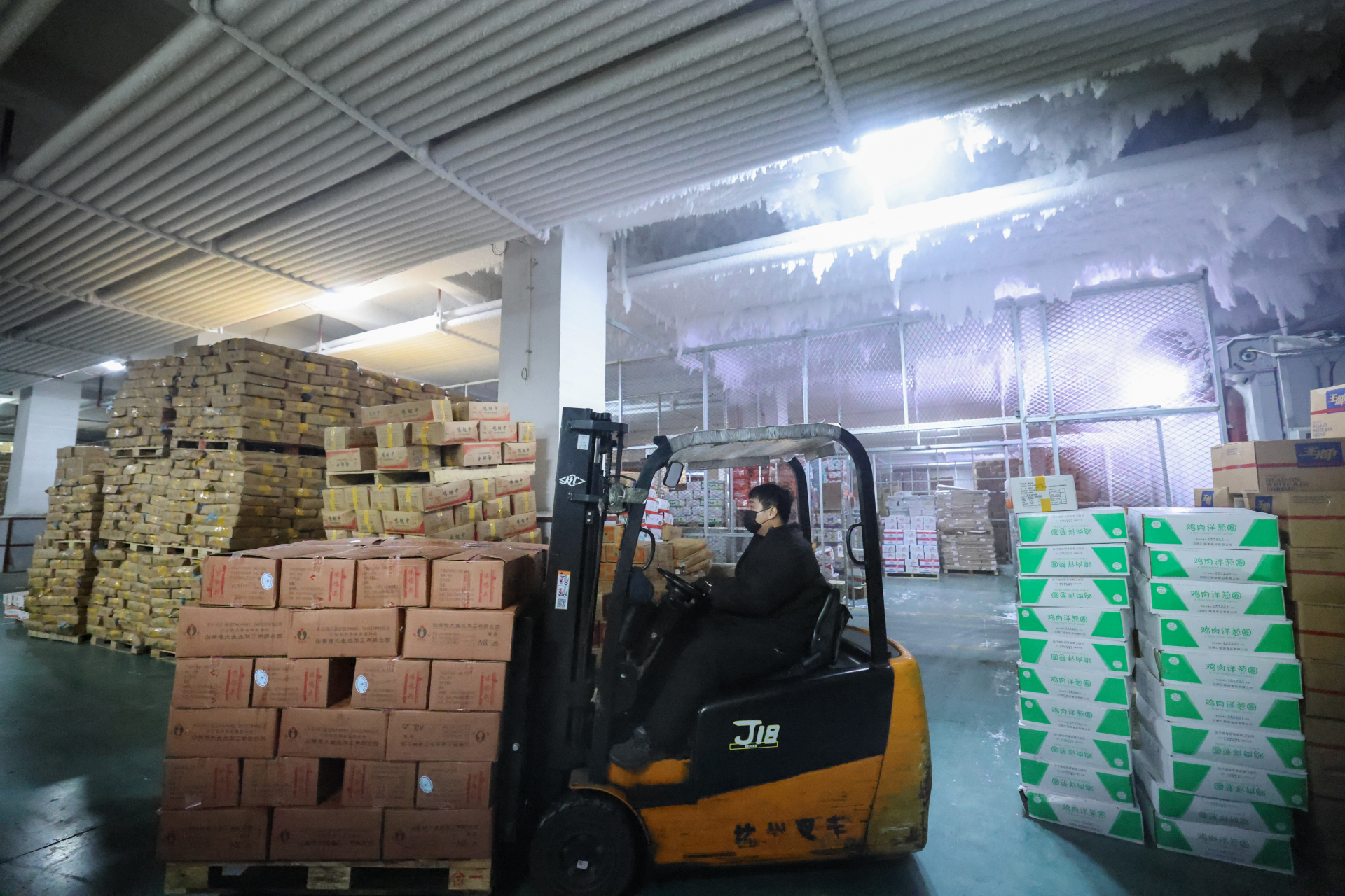 全副武装的叉车驾驶人员穿梭于冰火之间,将一辆辆冷藏车里的货物转运至冷库内,他们动作熟练,进入冷库几分钟就能出来。而冷库外放的多件棉衣棉裤,是供拉货人员穿的,他们驾驶三轮车停在门外,全副武装后才能进入冷库,找到货物所在地,配货完成迅速出来。