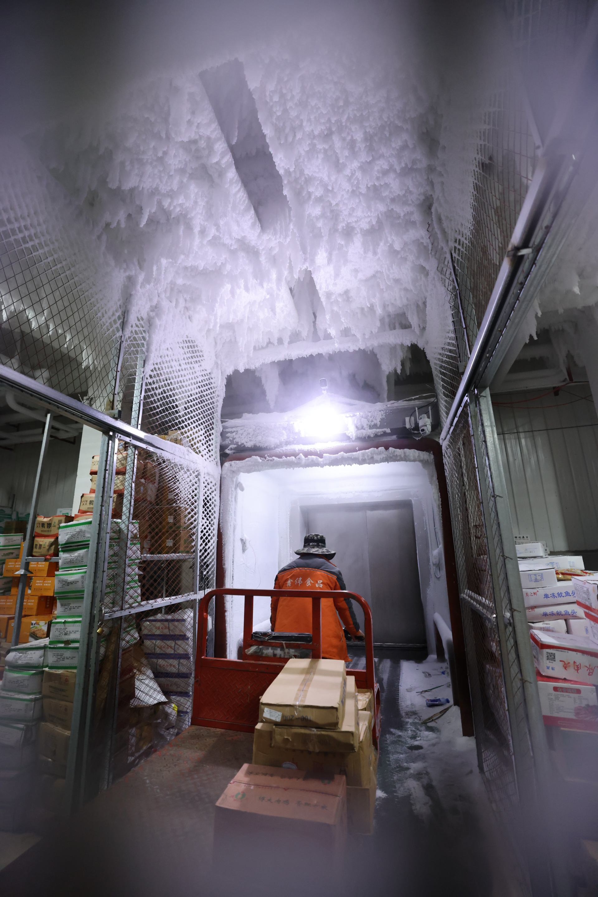 合一冷链物流园目前拥有12万吨低温冷库,零下21℃的低温下,棉衣、棉裤、棉鞋、手套、帽子、口罩是进入冷库的标配。打开冷库大门,记者身穿棉衣进入冷库,团团白雾夹杂着寒气扑面而来,让人不禁打了个冷战,穿过眼前这团白雾,温度骤然下降,视线逐渐清晰,顶上结着霜的管道,令人一下有了进到冰箱里的实感,感觉穿越到了冬季。