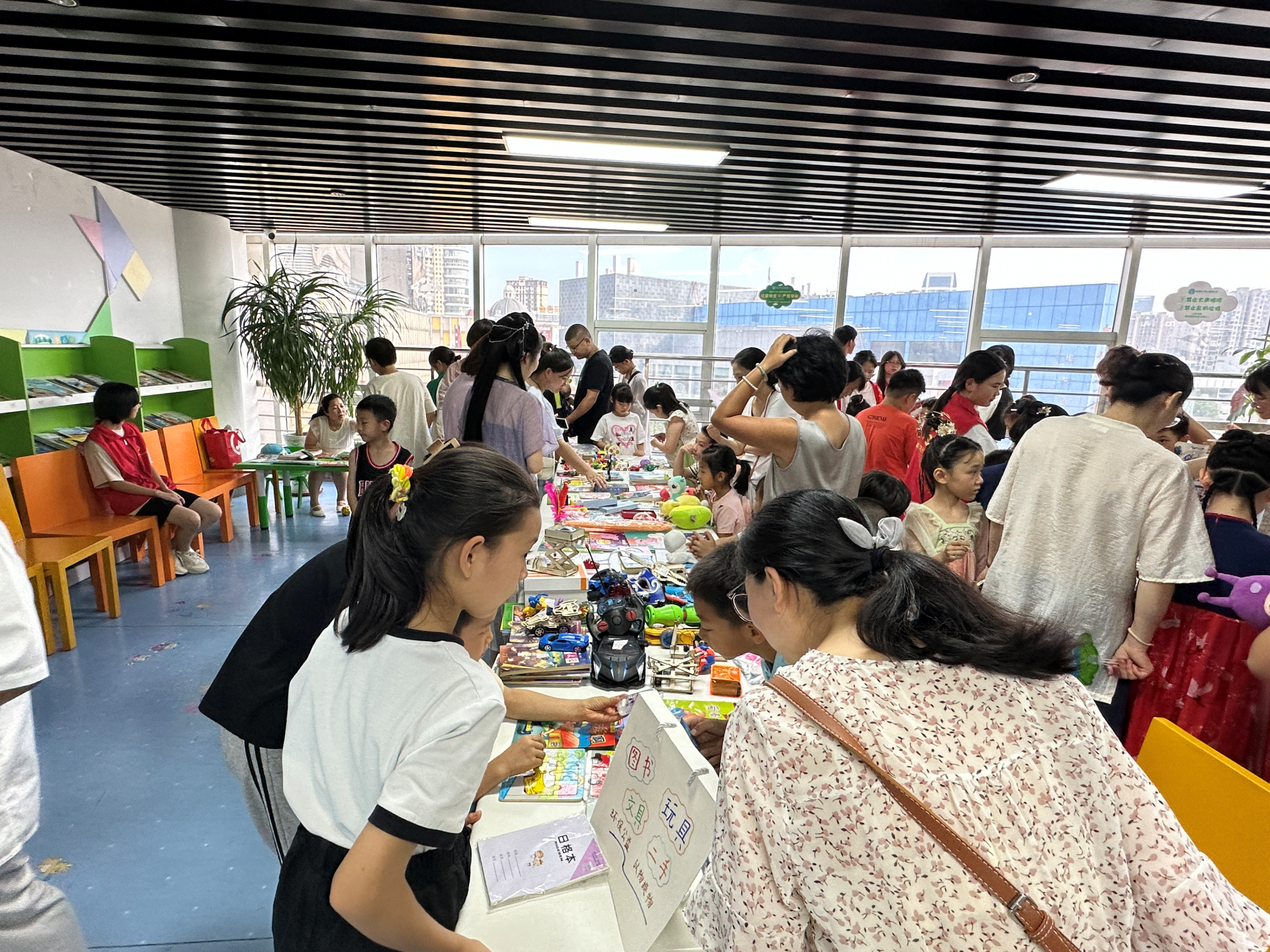 在不远处,图书市集吸引了不少小读者。十多个摊位上摆放着各式各样的书籍、文创、文具、旧物等。“小摊主”负责布置摊位和“售卖”货品,“小买家”则挑选自己喜欢的东西,大家交易宝贝、结交朋友、分享经验,欢声笑语充满整个市集。