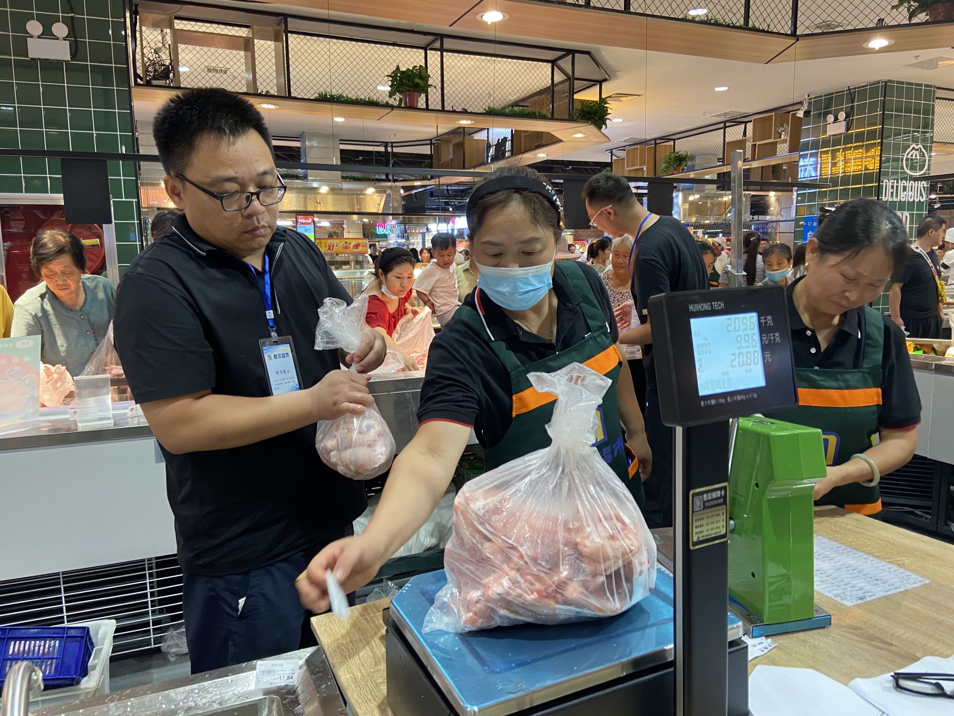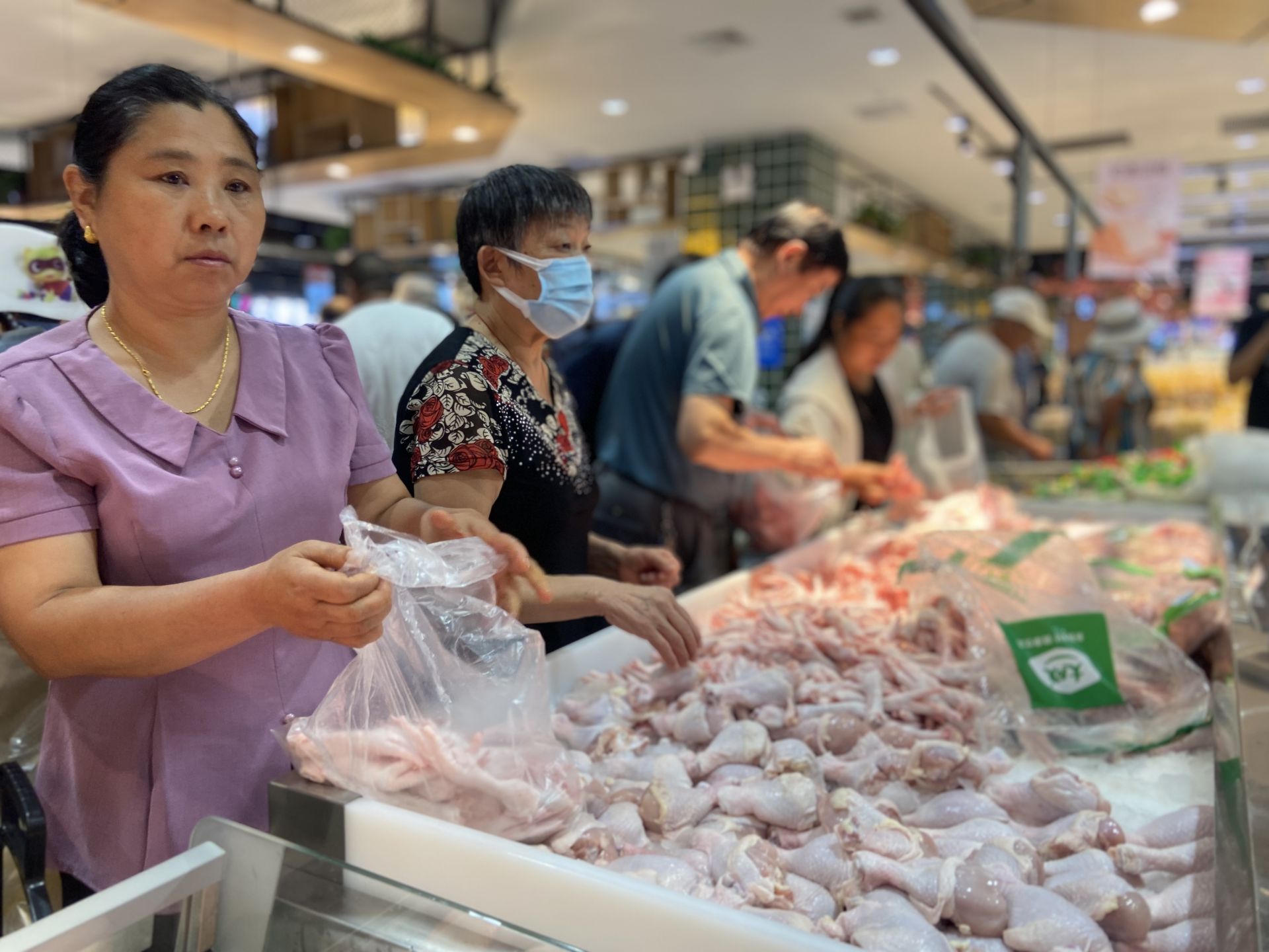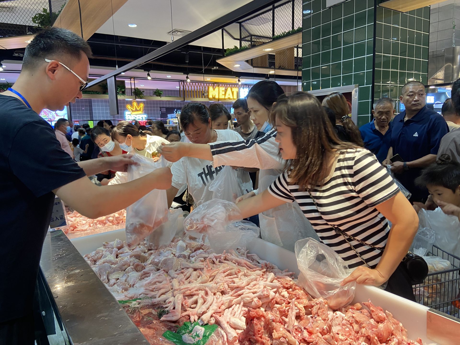 9月1日,安徽省固镇县城一大型生鲜超市开业第一天,生鲜区内人气火爆,产自蚌埠大成食品有限公司的2000斤新鲜鸡肉产品不到两小时就被抢购一空,成为当日最畅销产品。(许家明)