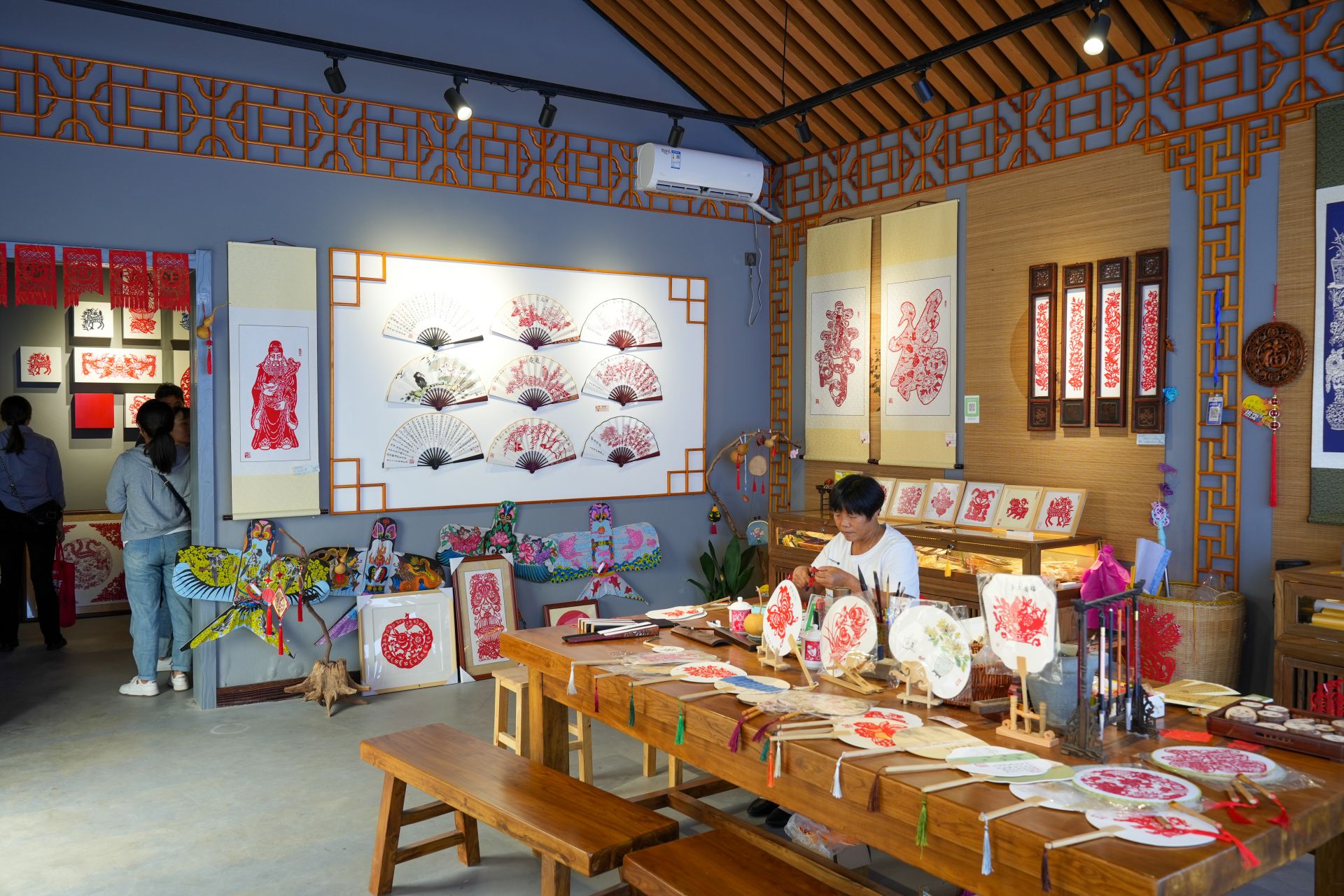 刘华飞剪纸工作室和荟萃编制布艺坊比邻而居。“剪纸艺术是最古老的中国民间艺术之一,是一种镂空艺术,它能给人以视觉上以透空的感觉和艺术享受,我们从2021年入驻垓下景区,一直从事剪纸教学和传承工作。”固镇县剪纸艺术协会会长刘华飞是这间剪纸工作室的负责人,她介绍,剪纸工作室展示了很多特色的剪纸作品,安徽·固镇菊花文化旅游季期间游客们可以在工作室内学习剪纸技术,制作剪纸菊花折扇,亲手体验剪纸的魅力。