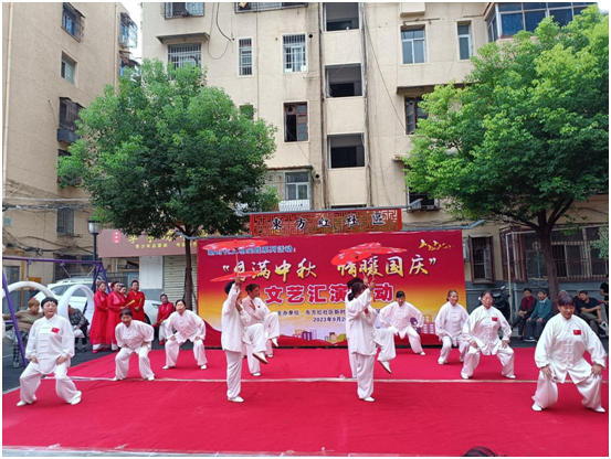 文艺汇演在东方红社区郭桂芹书记精彩的独舞中拉开序幕,社区老年大学的学员们表演唱《老两口学毛选》赢得现场居民们的阵阵掌声,一首《草原上升起不落的太阳》歌曲献给我们美丽强大的祖国,精彩的花鼓灯、太极、双人舞、模特表演给居民们带来了一场视听盛宴,热情洋溢的民族舞和古典舞将少数民族文化魅力展现得淋漓尽致。活动中还穿插有奖问答互动环节,宣传文明创建、反诈等知识,现场居民积极参与抢答,既宣传了党的政策又拉近了与距离。