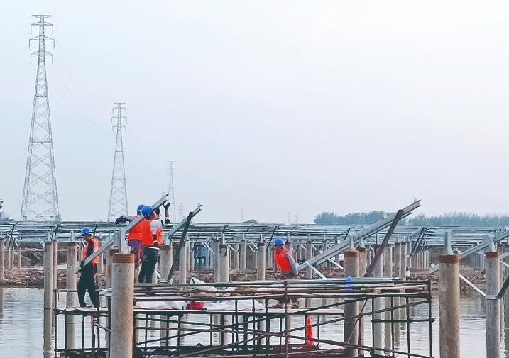 在怀远县100MWp渔光一体光伏发电项目建设现场,土建工作基本完成,工人往来穿梭,太阳光伏发电单元有序安装,开启项目建设“加速度”。