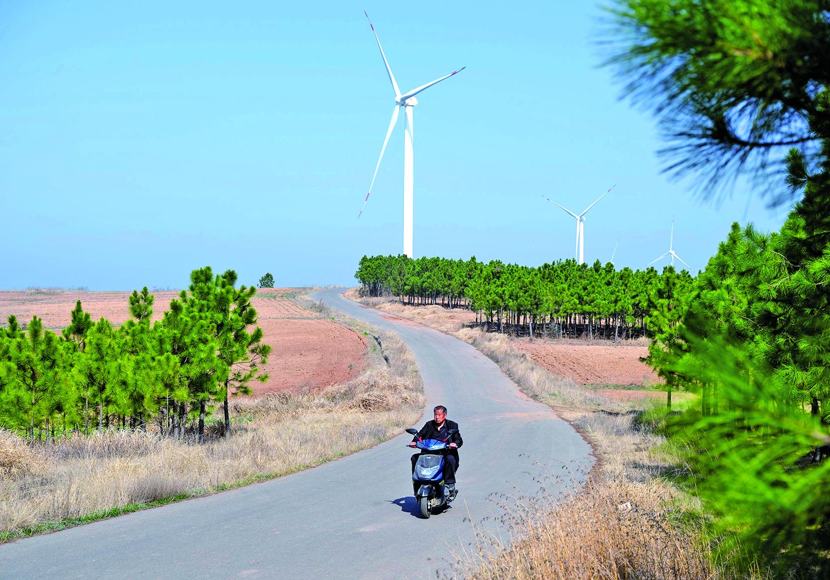 五河县朱顶镇丘陵地区,一台台大风车迎风转动。我市首个风力发电场——五河县饮马湖风力发电场,年发电约1亿千瓦·时,年节能3.18万吨标准煤,减少二氧化碳排放8万吨。