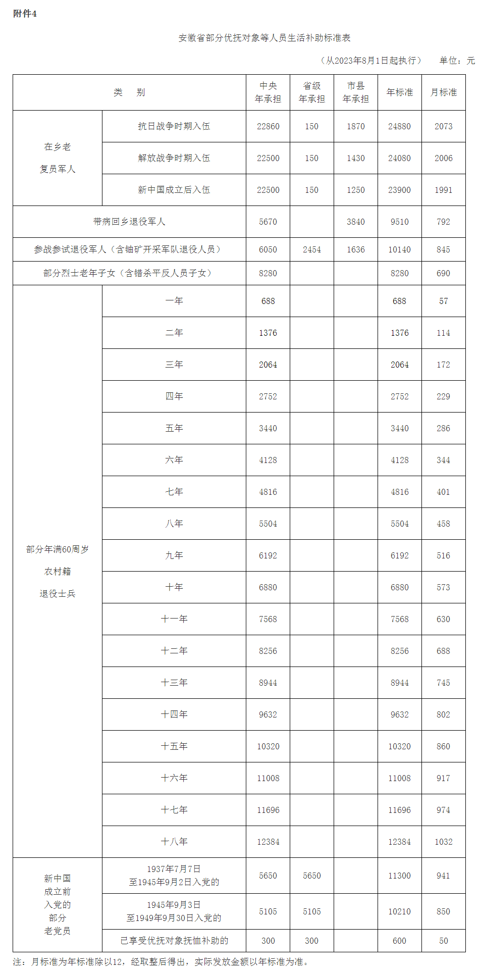 附件:1. 残疾军人、伤残人民警察、伤残预备役人员和民兵民工、其他因公伤残人员残疾抚恤金标准表2. 烈属、因公牺牲军人遗属、病故军人遗属定期抚恤金标准表3. 在乡退伍红军老战士、红军失散人员生活补助标准表4. 安徽省部分优抚对象等人员生活补助标准表