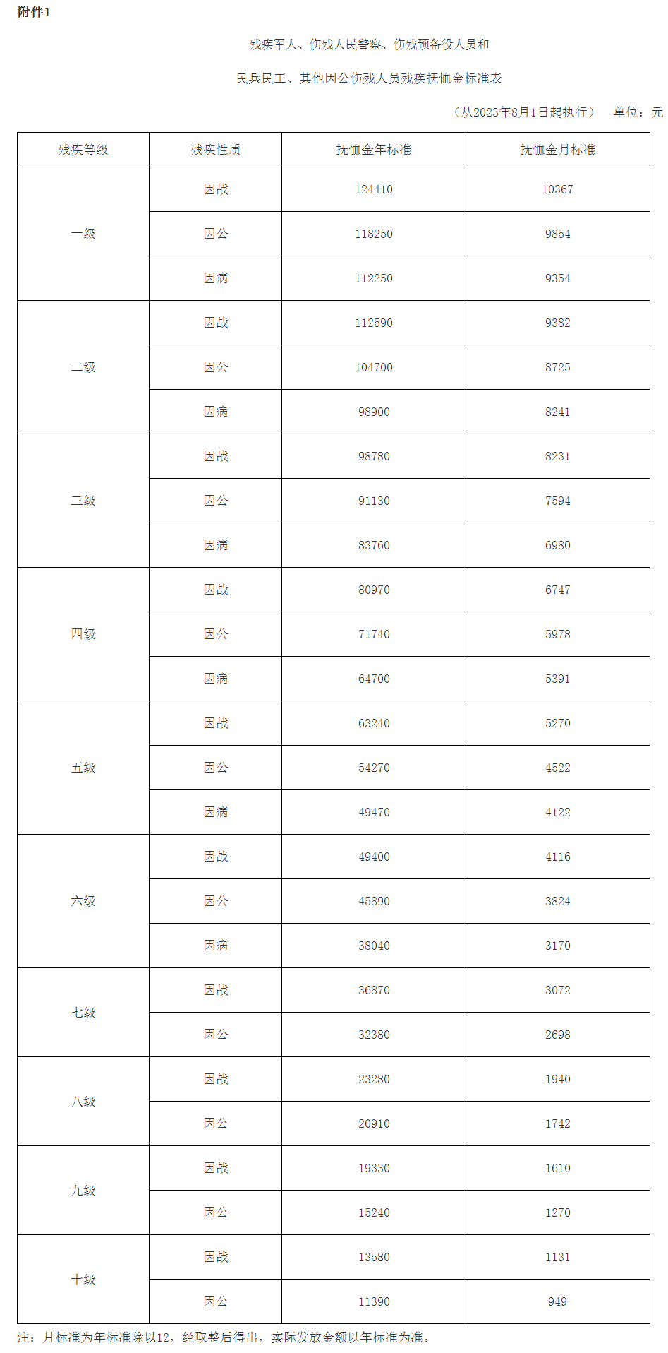 一、提高残疾军人(含伤残人民警察、伤残预备役人员和民兵民工、其他因公伤残人员)的残疾抚恤金、烈属(含因公牺牲军人遗属、病故军人遗属)的定期抚恤金、在乡退伍红军老战士(含红军失散人员)的生活补助标准,调整后的标准见附件,所需经费由中央财政承担。