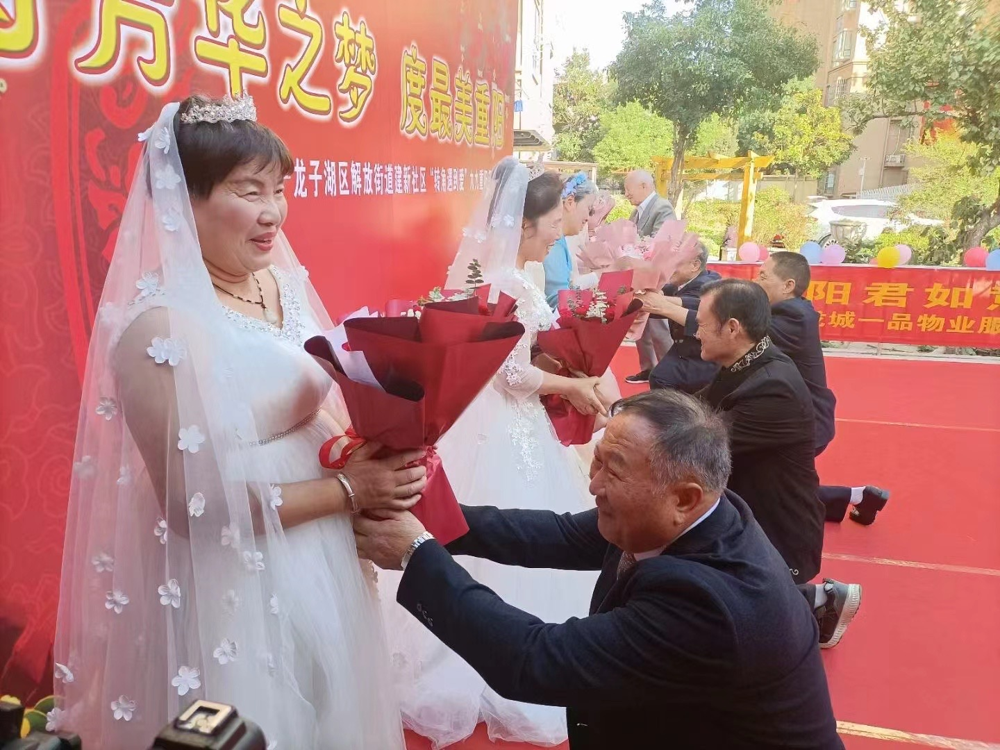 “圆芳华之梦 度最美重阳”龙子湖区“转角遇到爱”九九重阳银发集体婚礼10月20日下午在解放街道建新社区新时代文化长廊举行。10对银发夫妇携手相伴,以爱之名,在众人的见证下“完婚”,不仅大声说出爱的“告白”,重温爱的浪漫,更用实际行动践行移风易俗。