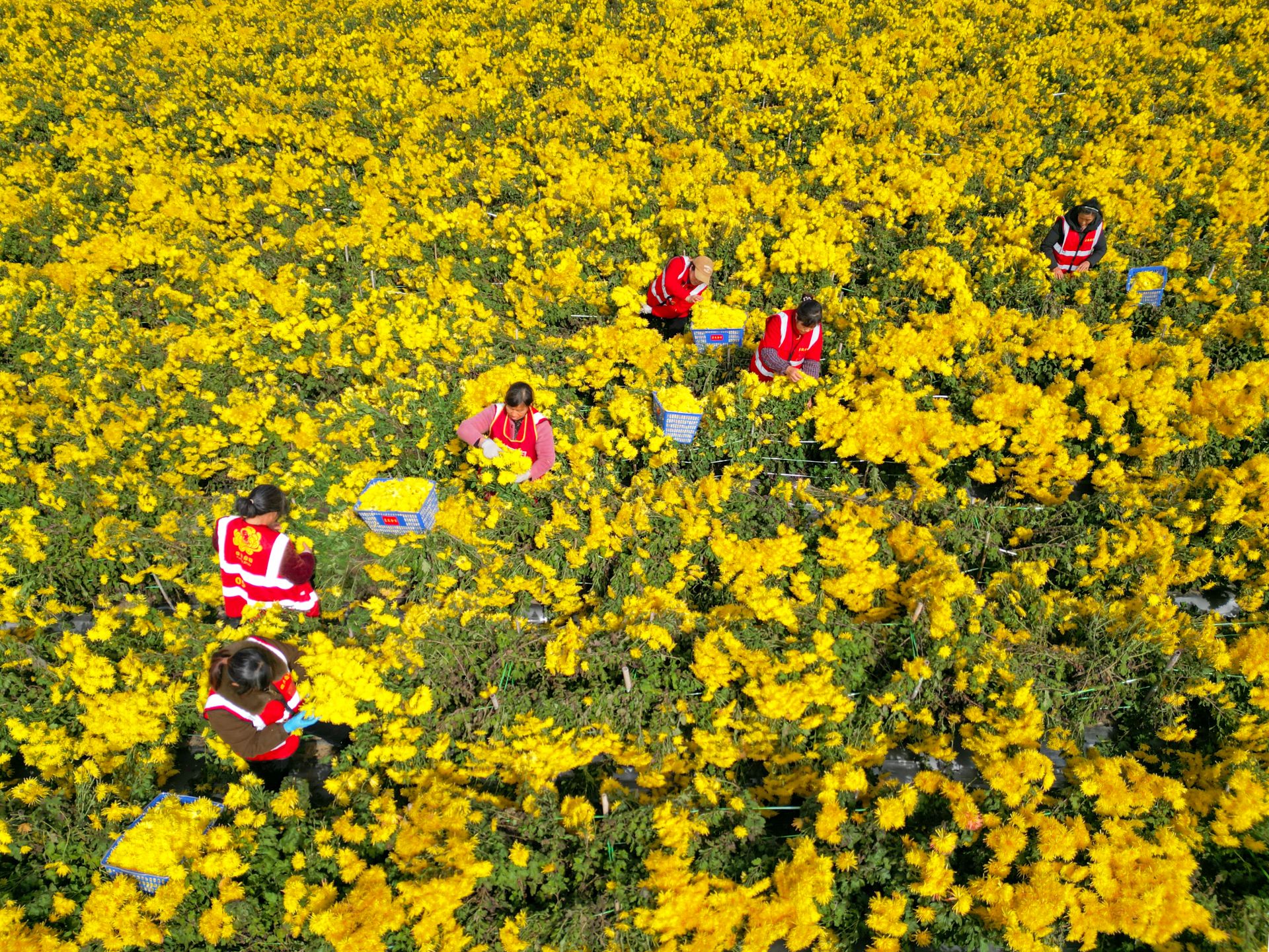初冬时节,在蚌埠市固镇县垓下景区的菊花种植基地,一簇簇菊花拔蕊怒放,工人们穿梭在花海中忙着采摘、分拣成熟的菊花,运到烘干车间进行深加工。
