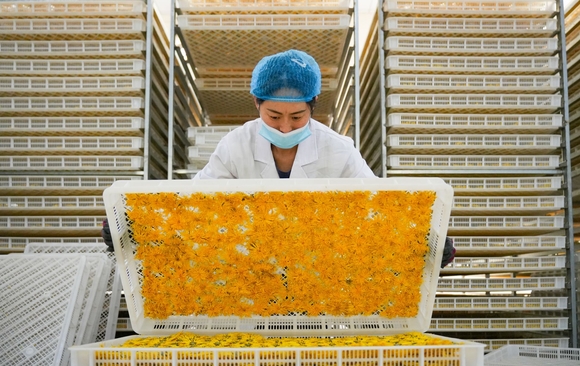 从菊花种植、养护到采摘、烘干、遴选再到包装、销售,一朵菊花就开出了一条产业链。在安徽虞美金菊生态农业旅游开发有限公司11000余平方米的现代化加工菊花茶厂房内,工人们将高高摞起的菊花推进烘干机,这些菊花在经过100小时的持续低温烘焙后,最终将被制作成为原汁原味的生态茶饮产品。