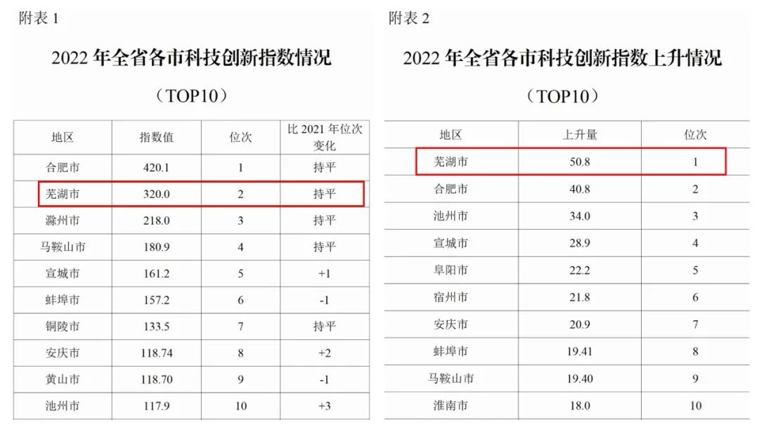 2022年,芜湖全社会研究与试验发展(R&D)经费支出169.4亿元,全社会研发投入强度升至3.76%,比上年提高0.28个百分点。2020-2022年,全市财政科技支出年均增长率15.8%,高出财政支出年均增长率6.2个百分点,有力推动了创新主体培育、创新能力建设和创新成果转化。在日前刚刚发布的安徽省2022年科技创新指数榜单中,芜湖以得分320.0的好成绩远超全省平均水平,稳稳占据全省第二位次,同时以上升指数50.8成为全省科技创新指数上升幅度最大的城市。