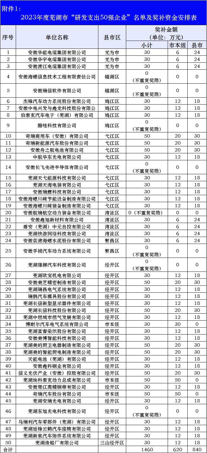 日前,2023年度芜湖市研发投入和研发投入强度“研发双50强企业”排名工作完成申报、审查、审核、公示等所有程序,进入资金兑现环节。奇瑞汽车等88家芜湖企业入榜,将获得总计3040万元奖补资金。