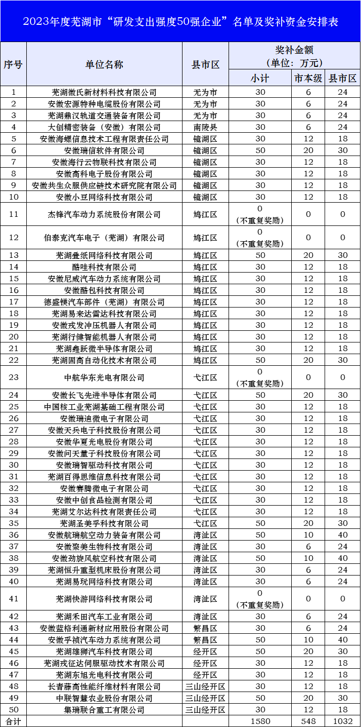 记者从芜湖市科技局了解到,为了鼓励企业持续加大研发投入,从2019年至今,该市已连续四年开展“研发双50强企业”排名工作,累计投入资金1.2亿元。