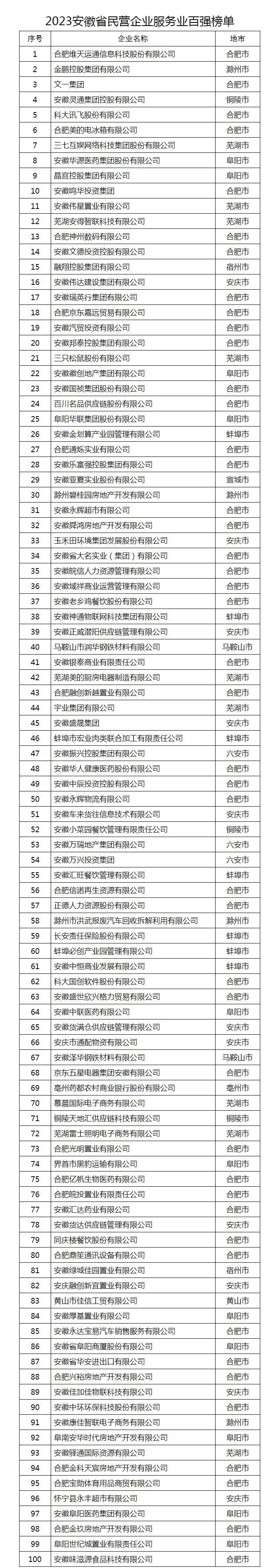 2023安徽省民营企业服务业百强榜单