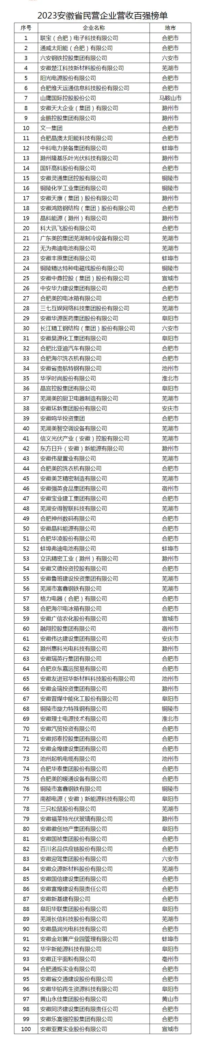 2023安徽省民营企业营收百强榜单