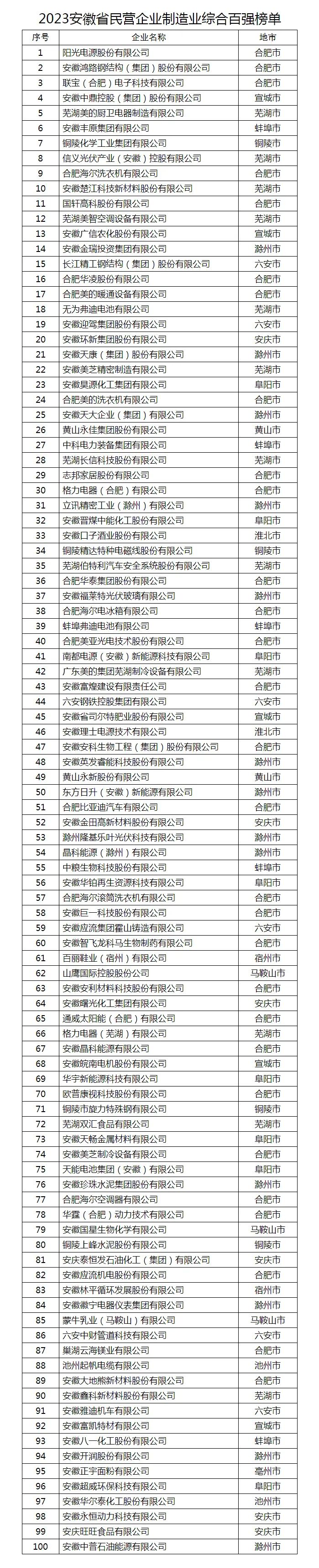 2023安徽省民营企业制造业综合百强榜单
