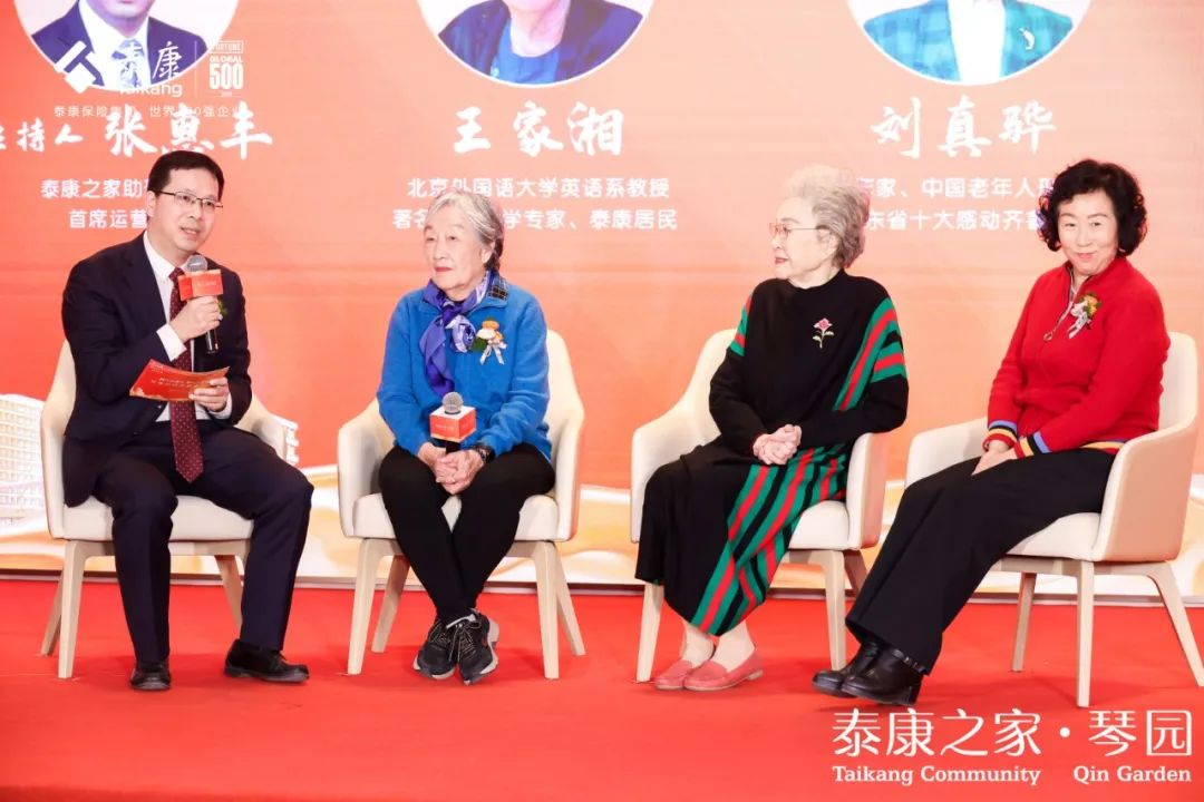 在活动当天的圆桌论坛环节,北京外国语大学英语系教授、著名英美文学专家、泰康之家·燕园居民王家湘,著名作家、中国老年人形象大使、山东省十大感动齐鲁老人刘真骅,青岛市老龄工作委员会办公室原主任李雪华三位长辈,在泰康之家助理总裁兼首席运营官张惠丰的主持下,重点围绕养老观念、养老规划以及泰康之家的享老新生活等话题进行了精彩分享。