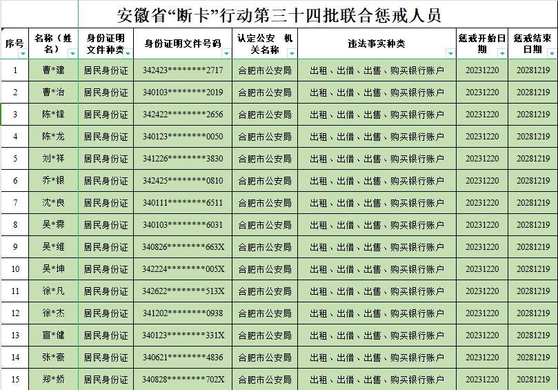 为严厉打击整治非法开办贩卖手机卡、银行卡违法犯罪,坚决遏制电信网络诈骗犯罪的高发态势,切实维护社会治安大局稳定,安徽省打击治理电信网络新型违法犯罪工作联席会议办公室公布“断卡”行动第三十四批联合惩戒名单。