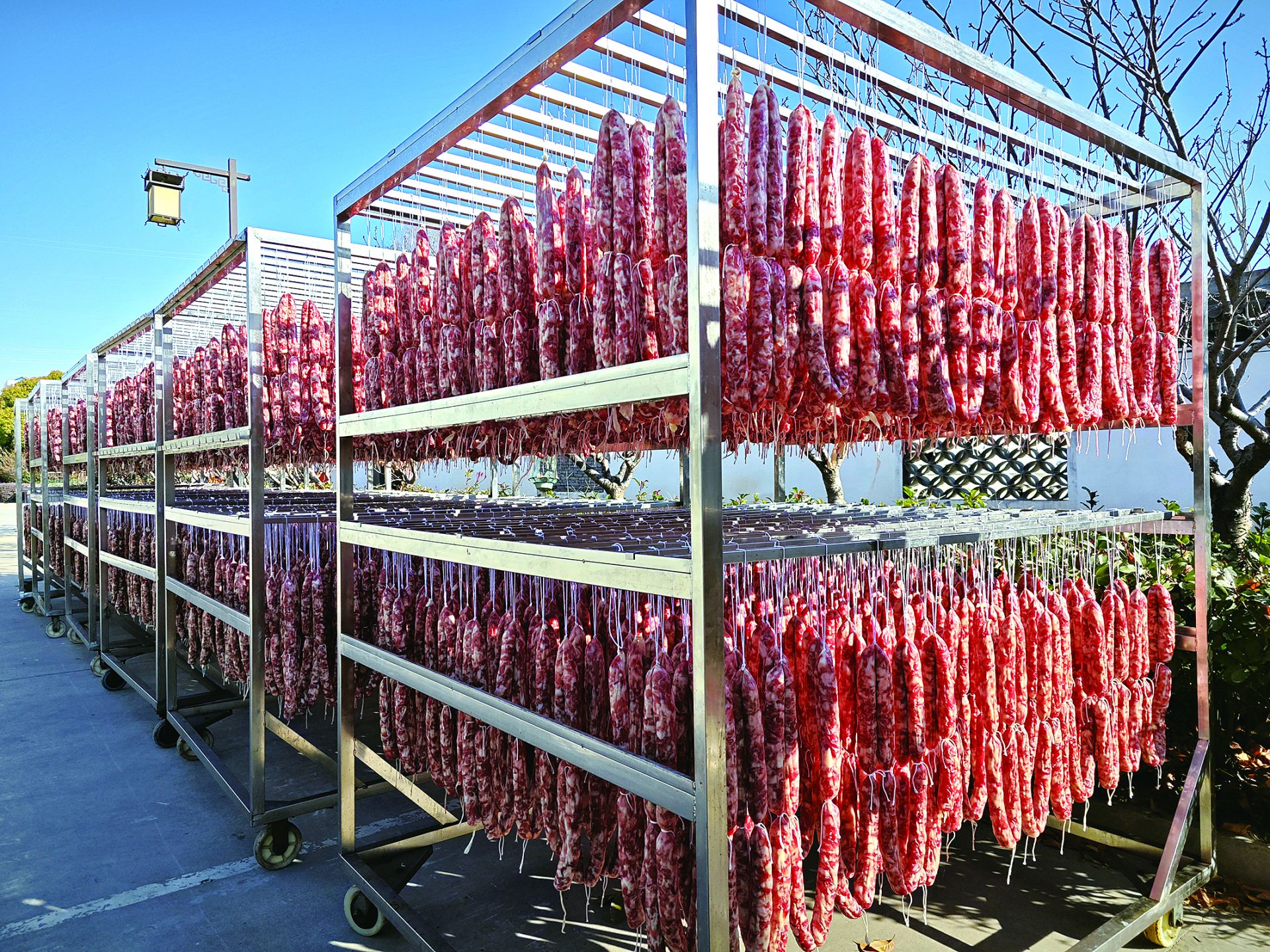 一条条腊肉、一根根腊肠在阳光下被照射的鲜红有色泽。“现在正在进行咸货的风干,为接下来的年货节做准备。”安徽卫食园肉类食品有限公司(下称“卫食园”)办公室主任罗轲说。