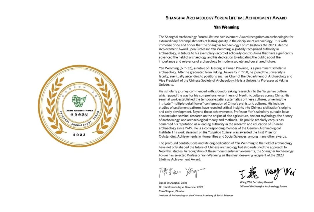2023年12月15日,上海。“第五届世界考古论坛”将“终身成就奖”授予北京大学的严文明教授。