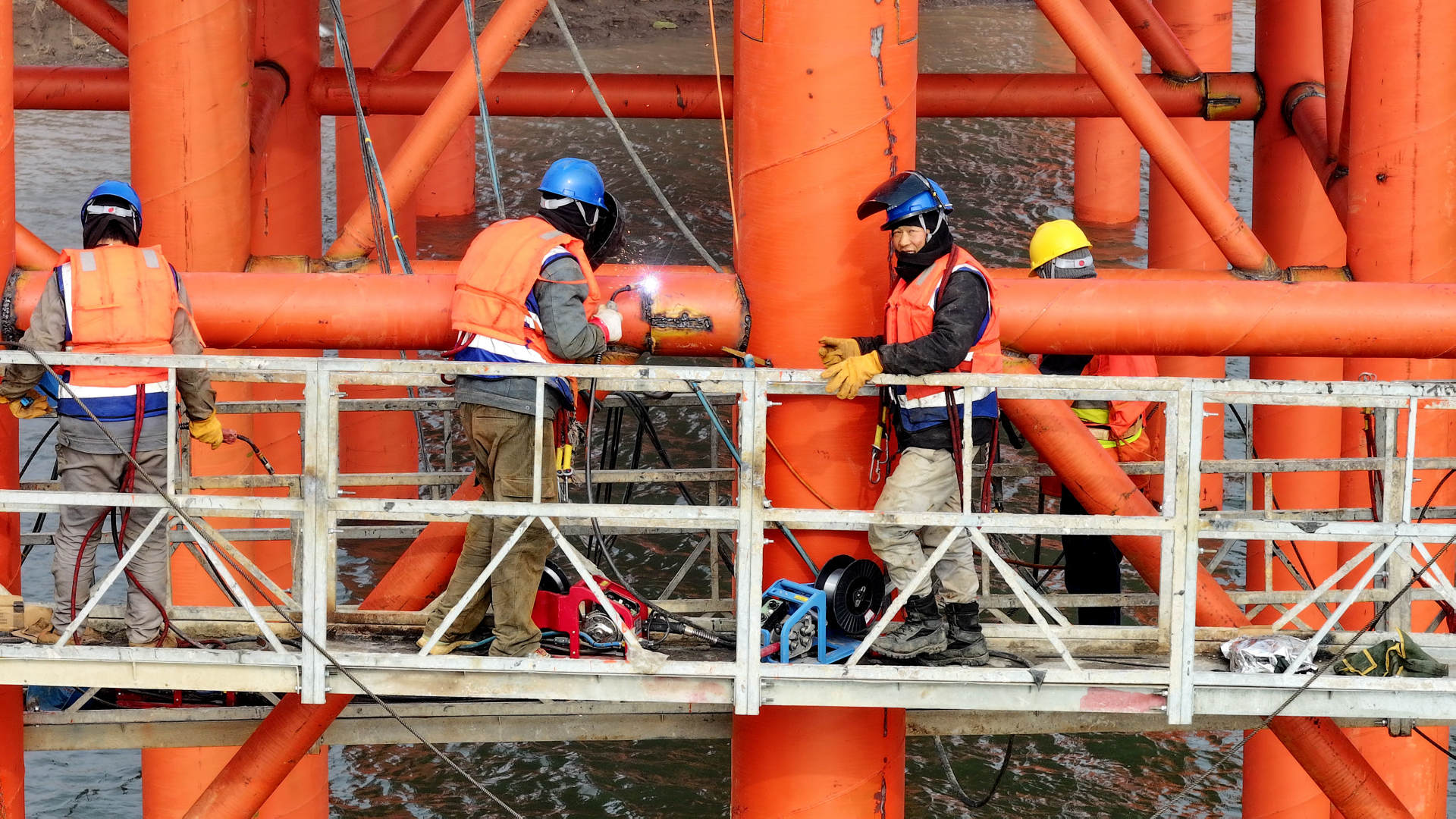 栈桥是主桥施工期间的临时交通通道。为了建设稳固的栈桥,需要打下坚实的基础,这就需要管桩。在半空中,大型振动锤在吊机的控制下,通过上下振动,逐渐将管桩打入地下。