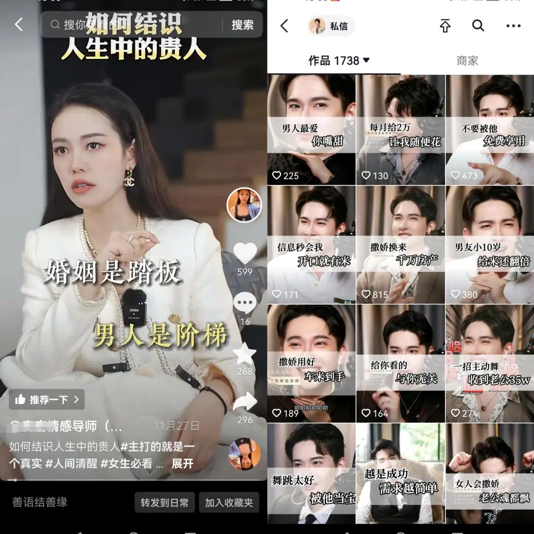 以“情感咨询”“女性成长”等关键词在短视频平台上检索,会出现不少类似的账号,粉丝最多的有上百万。例如,一自称“精英女性成长导师”的博主“X姐”在短视频中宣称“婚姻是踏板,男人是阶梯”,引导女性通过“吹牛”“包装”实现阶级跨越;另一粉丝过百万的男性博主“XXX宠爱力”主张女性通过撒娇等方式从男性身上获取金钱。据其分享的短视频内容,有不少连麦粉丝在他的“帮助”下获得了男性赠予的房车及巨额钱财。