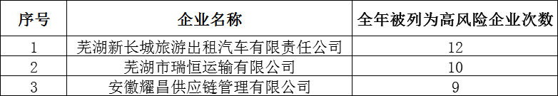 2023年度,全省有多家企业连续多次被列为高风险企业,其中,芜湖新长城旅游出租汽车有限责任公司、芜湖市瑞恒运输有限公司、安徽耀昌供应链管理有限公司分别有12次、10次、9次被评为高风险企业情形。请相关企业负责人引起重视,迅速落实整改措施!